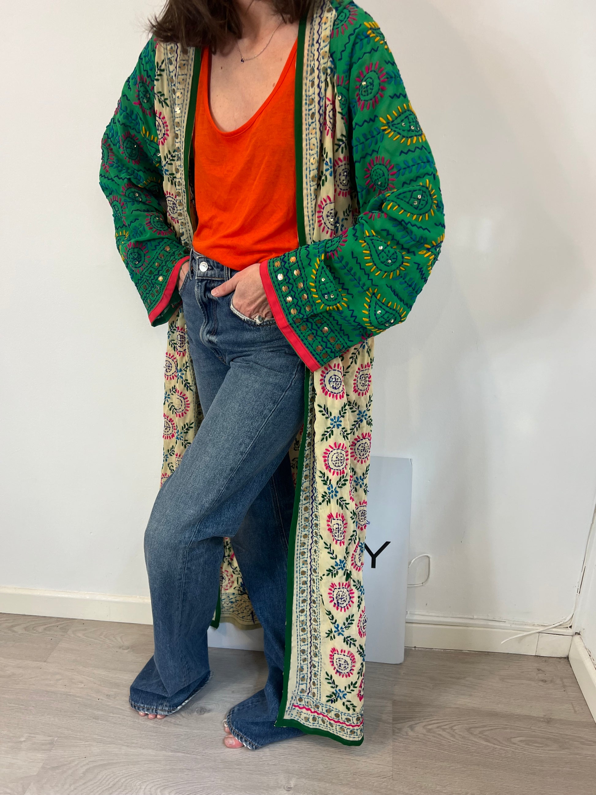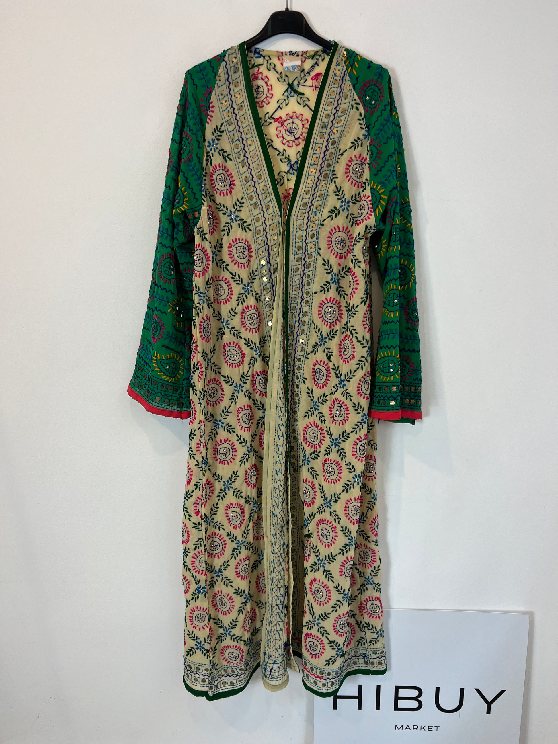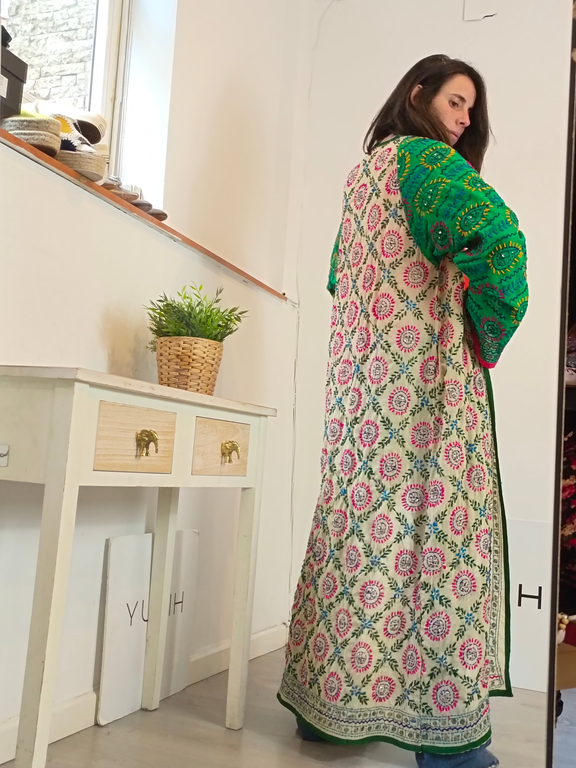 kimono largo multicolor con detalles bordados.