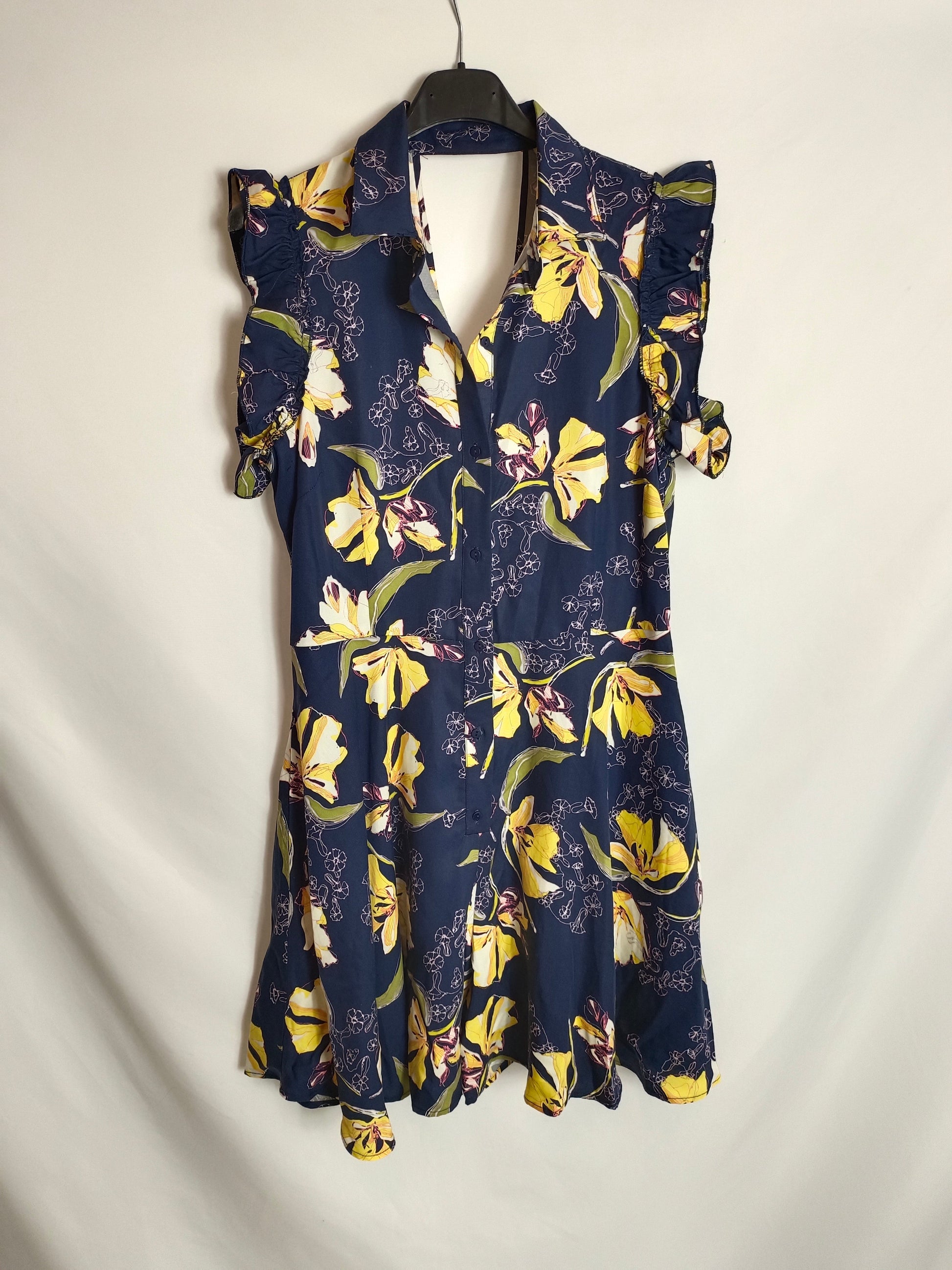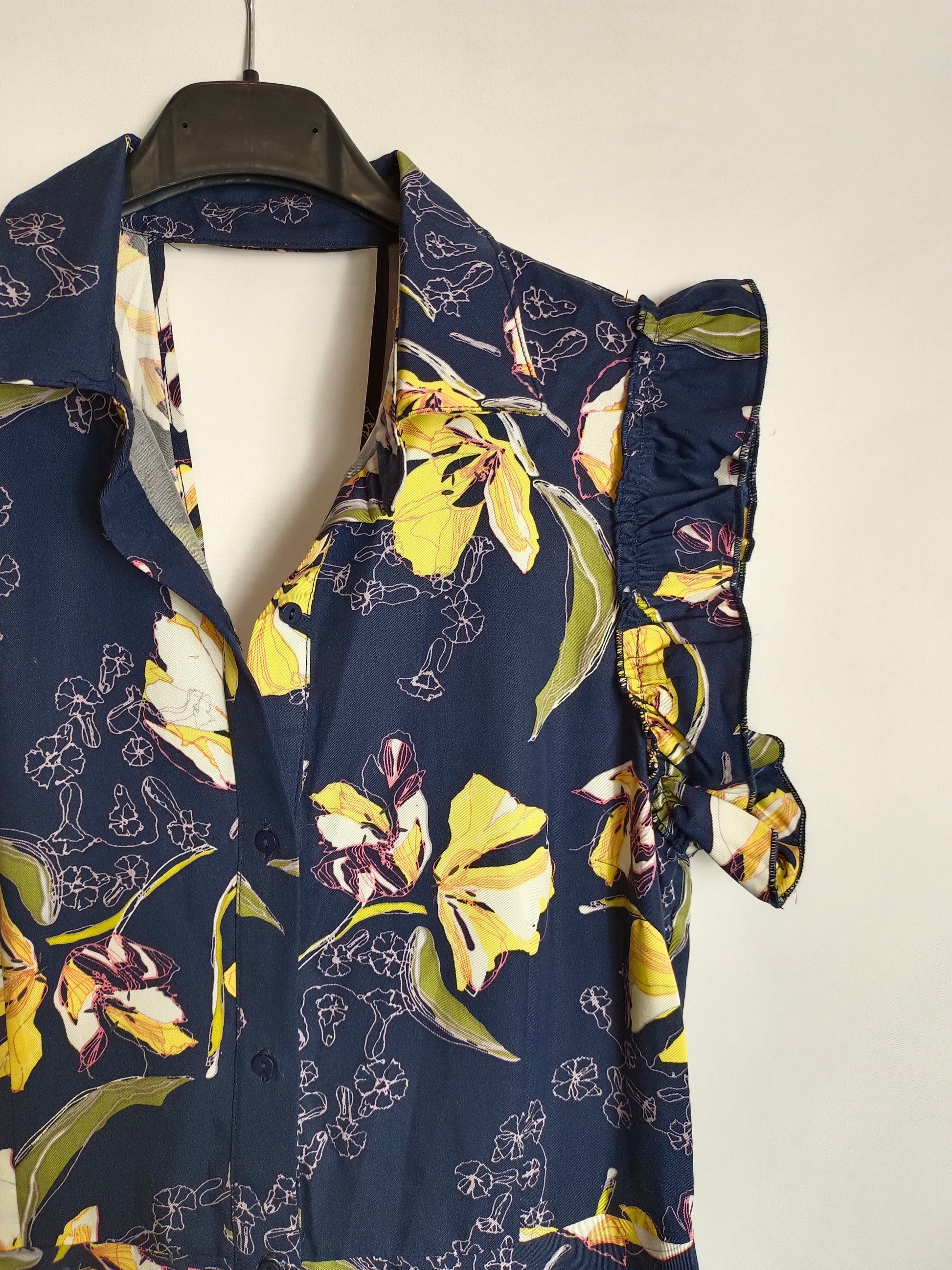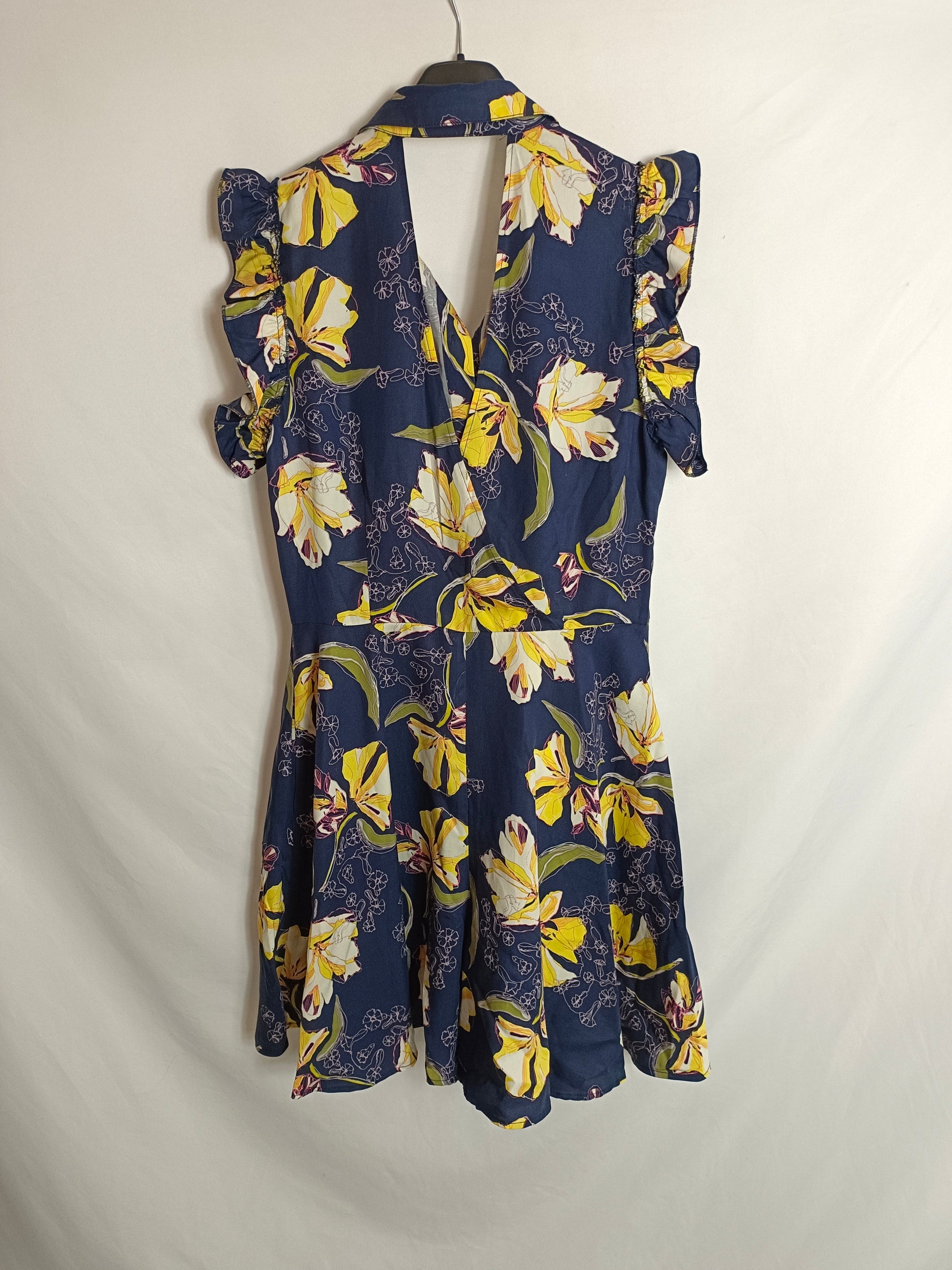 Mono corto azul con estampado de flores. Abotonado y espalda cruzada.