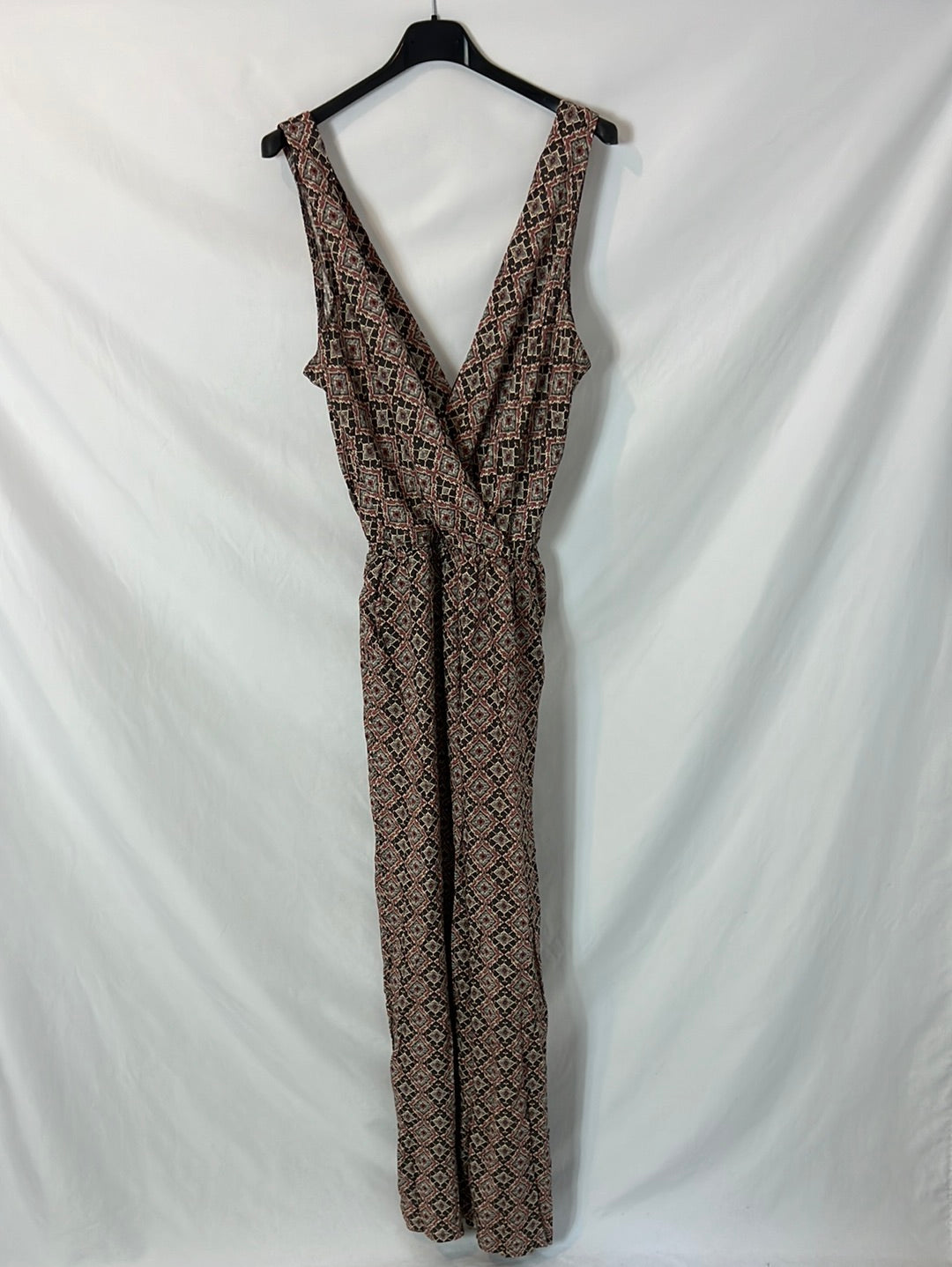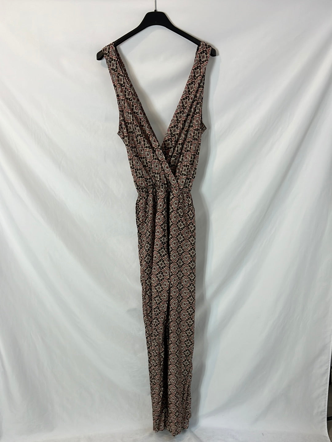 Mono largo fluido estampado con escote triangulo. Cintura elástica 34cm, largo 145cm