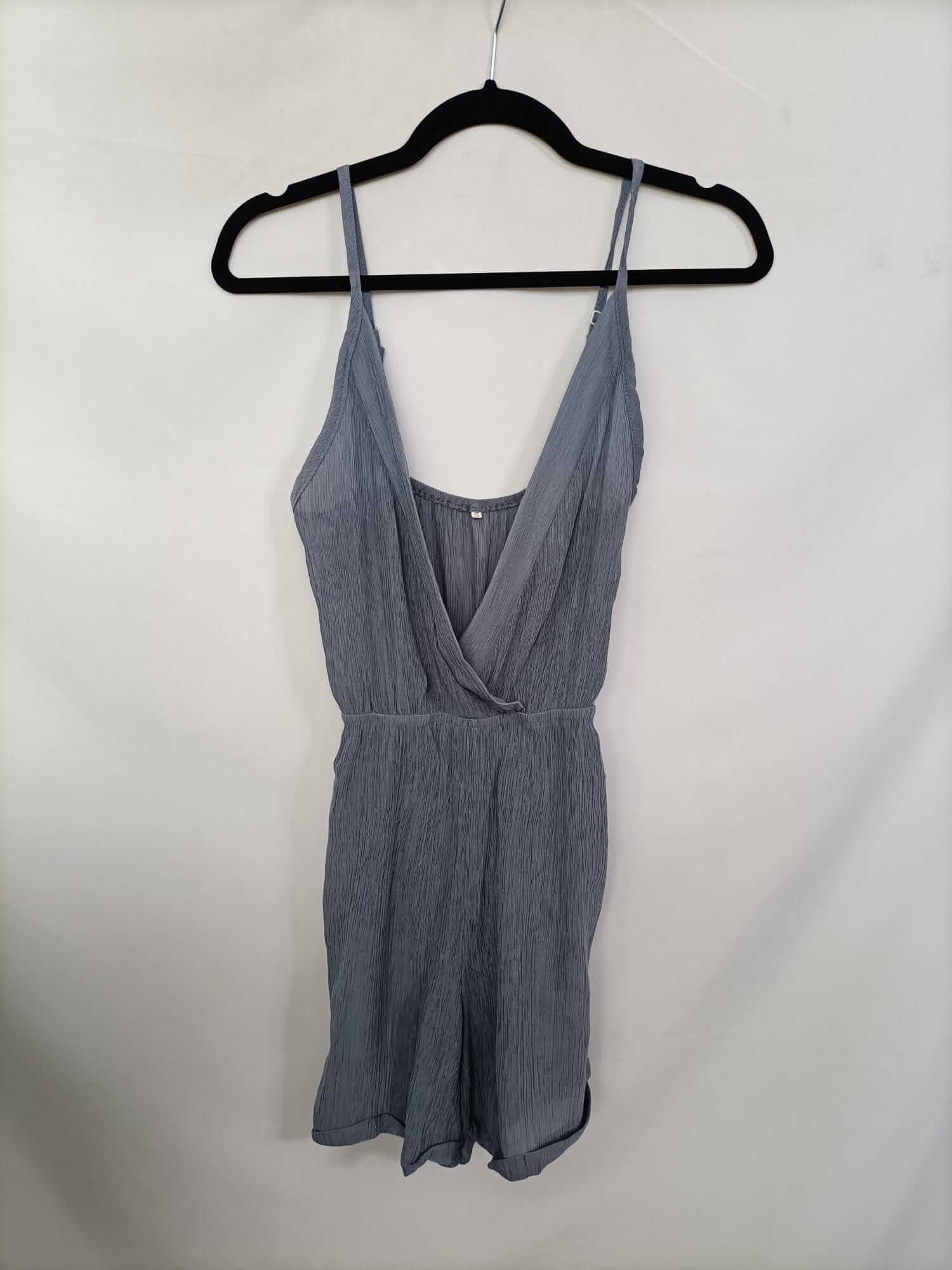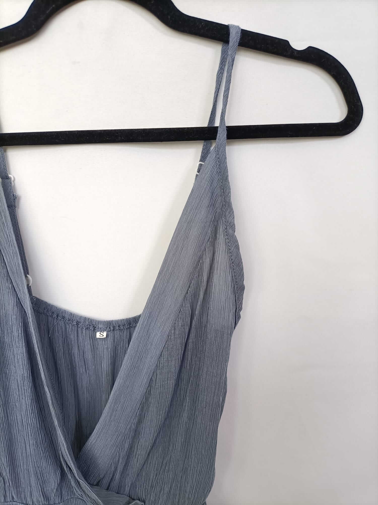 Otras. S. Mono gris de tejido plisado con escote cruzado y tirantes ajustables. Fluido. Largo 83 cm