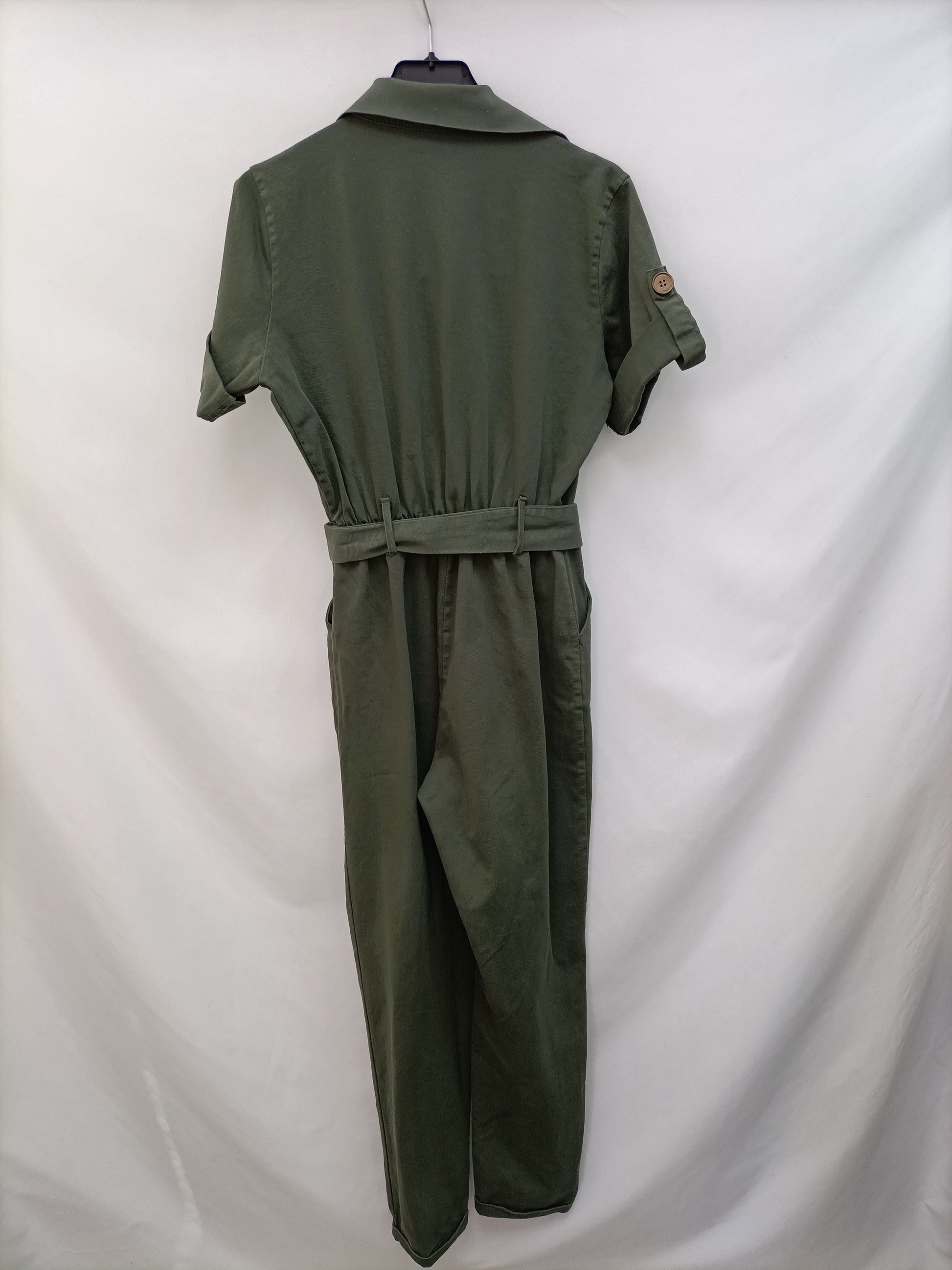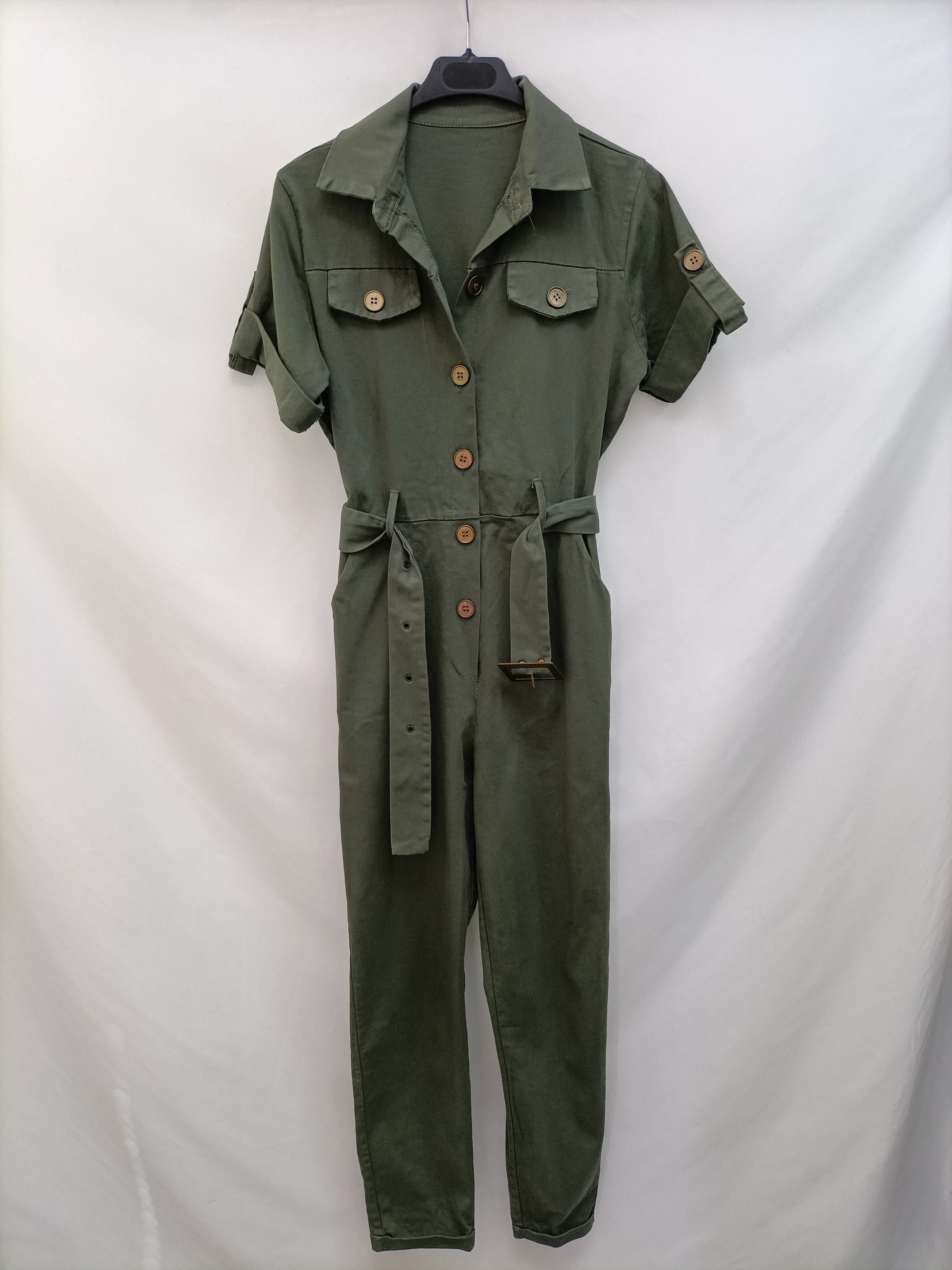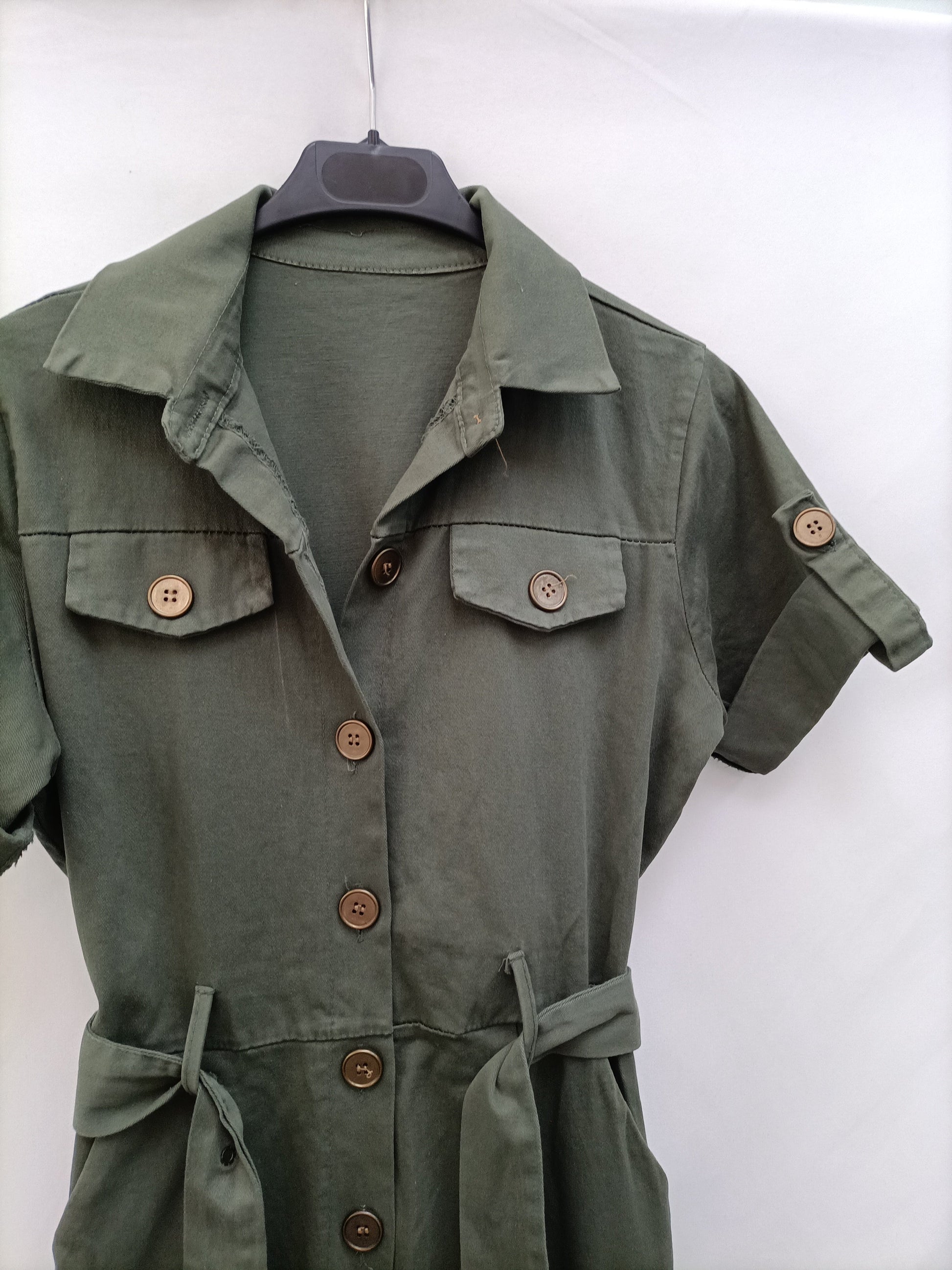 Mono largo verde Abotonado con cinturón. De sisa a sisa 46 cm largo 139 cm.