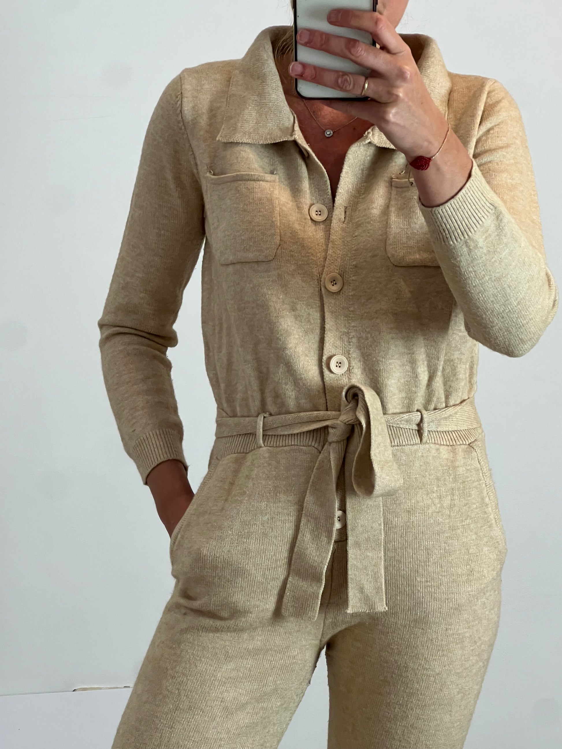 Mono de punto beige abotonado con lazada en la cintura. Elástico . Largo 135cm