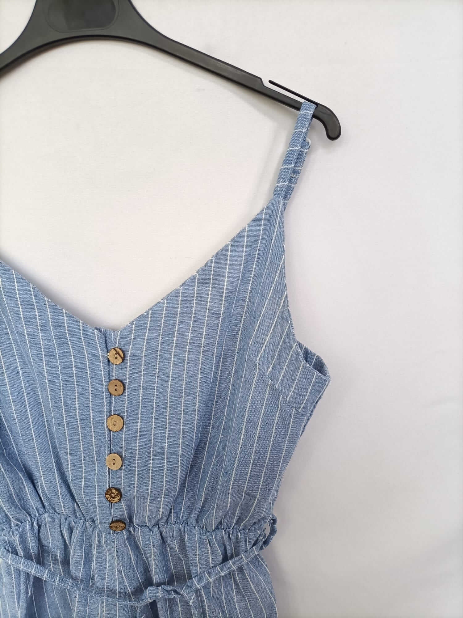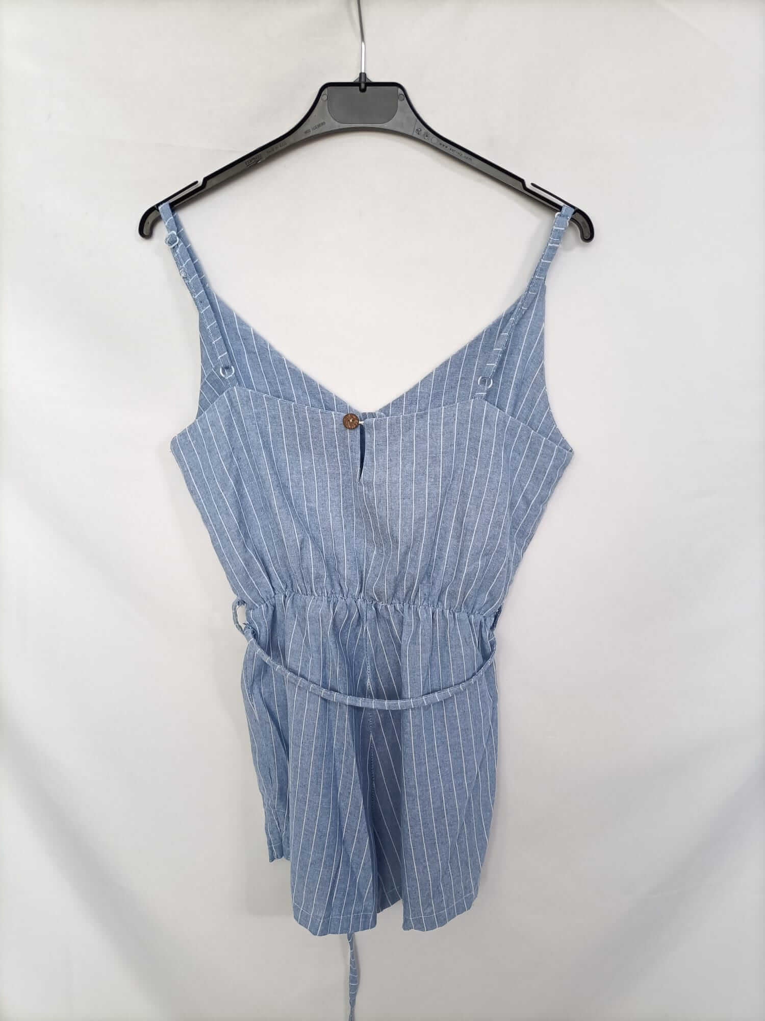 Otras.s. mono corto de rayas azul y blanco con cintura elástica y tirantes ajustables. Algodón. Detalle de cinturón con lazada. Largo 74 cm