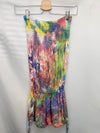 Mono con estampado de colores tie day, escote nido de abeja y se ajusta a la cintura con goma