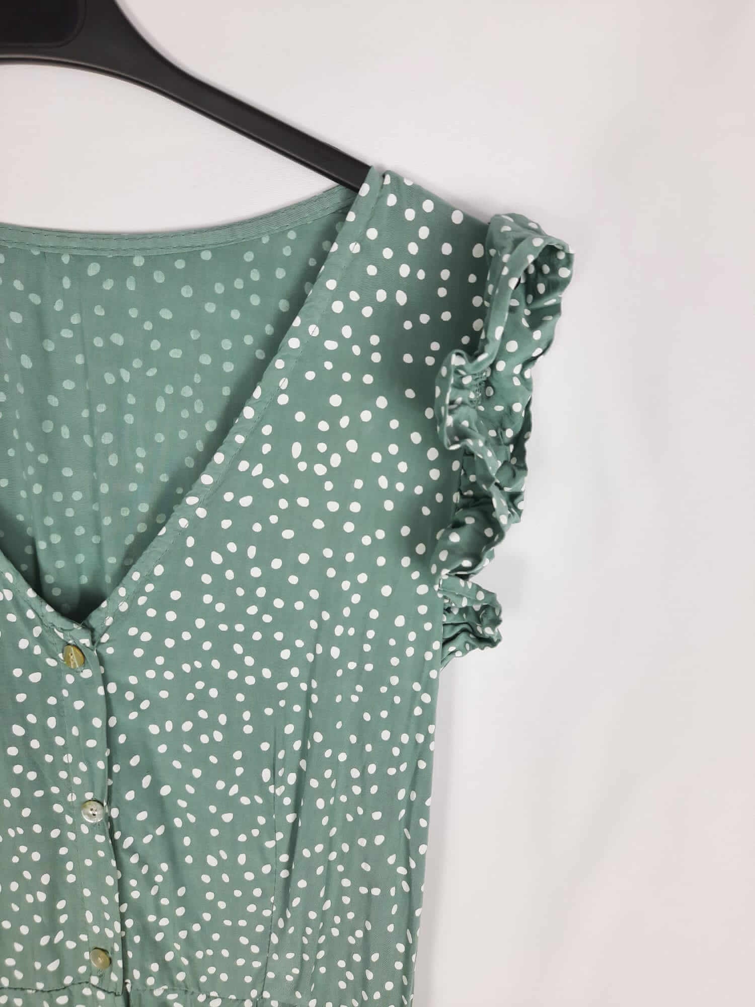 Otras. Mono verde fluido con lunares blancos abotonado y con volantito en las mangas. No elástico. De sisa a sisa 49 cm largo 134 cm