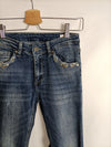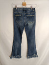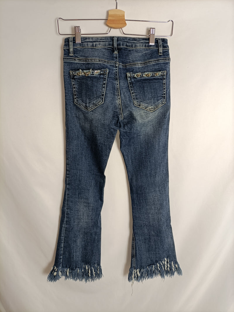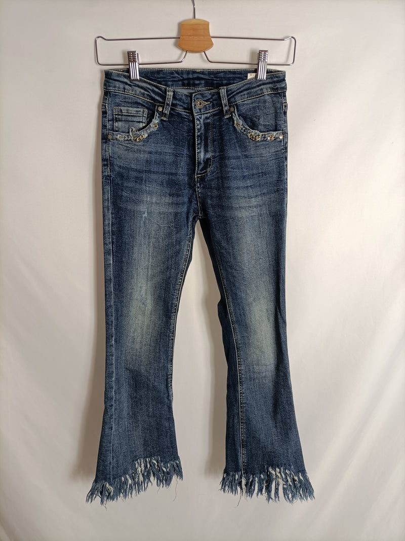 Pantalón vaquero con detalle de cadena en os bolsillos. Parte de abajo con flecos.