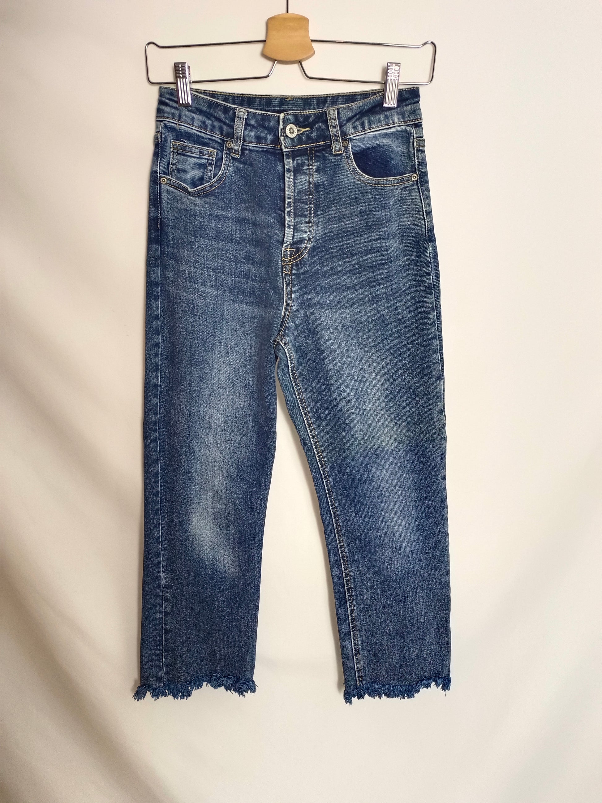 Pantalón vaquero de corte recto con fleco en la parte de abajo. semielástico y alto de cintura