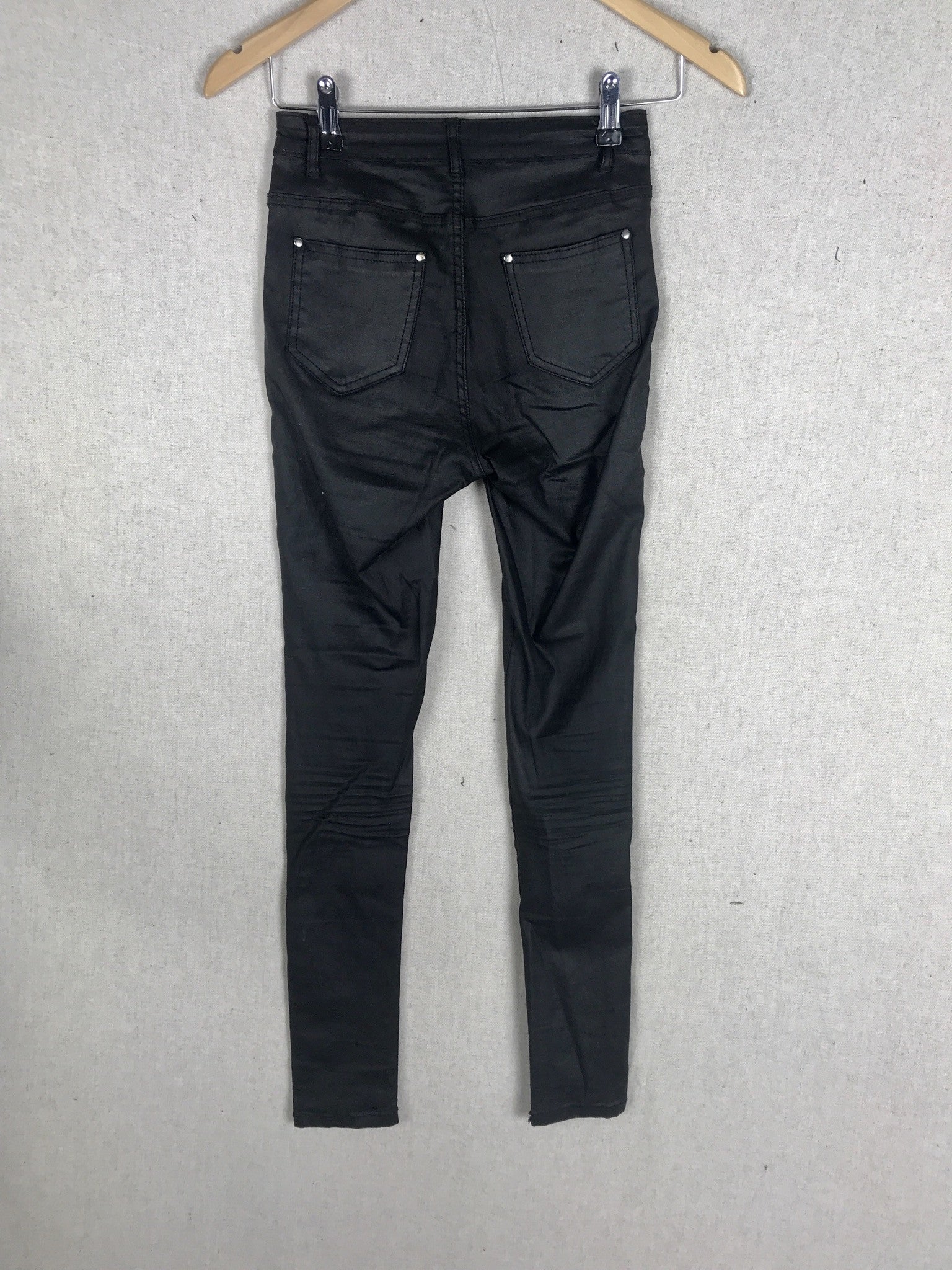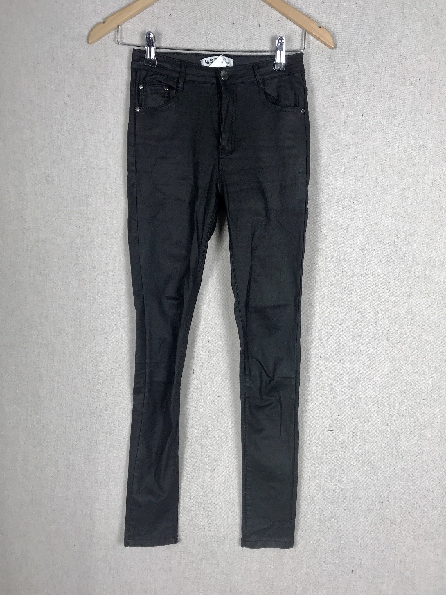 Pantalón negro de tejido encerado elástico, con el tiro alto. Cintura 28 cm.