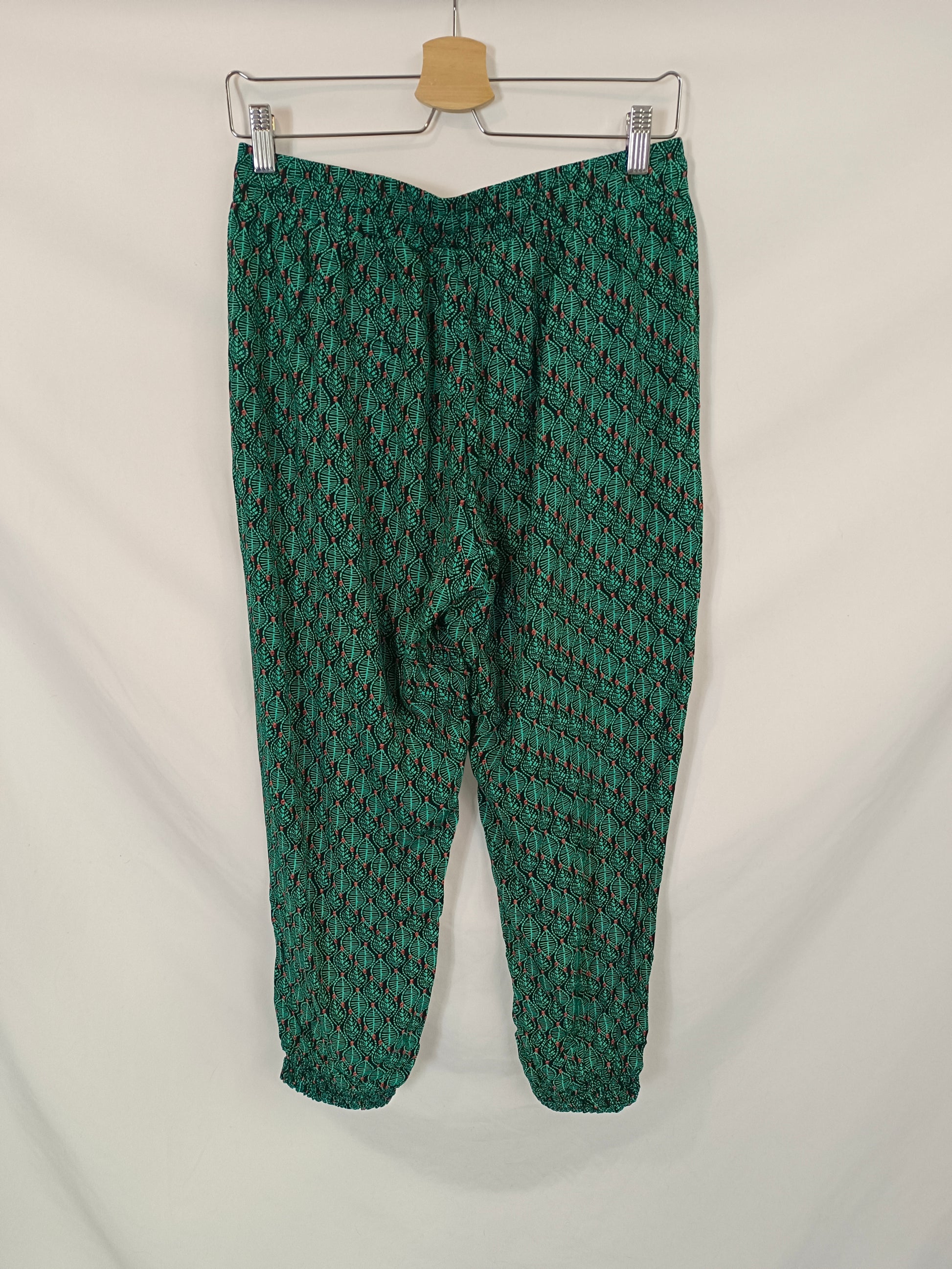 Pantalón fluido fluido negro con estampado verde. cintura elástica ajustable.
