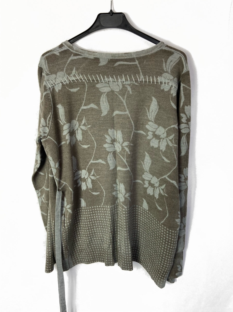 Rebeca marrón con flores en tono verde grisáceo, se abrocha con botones y tiene un lazo. Se elástica