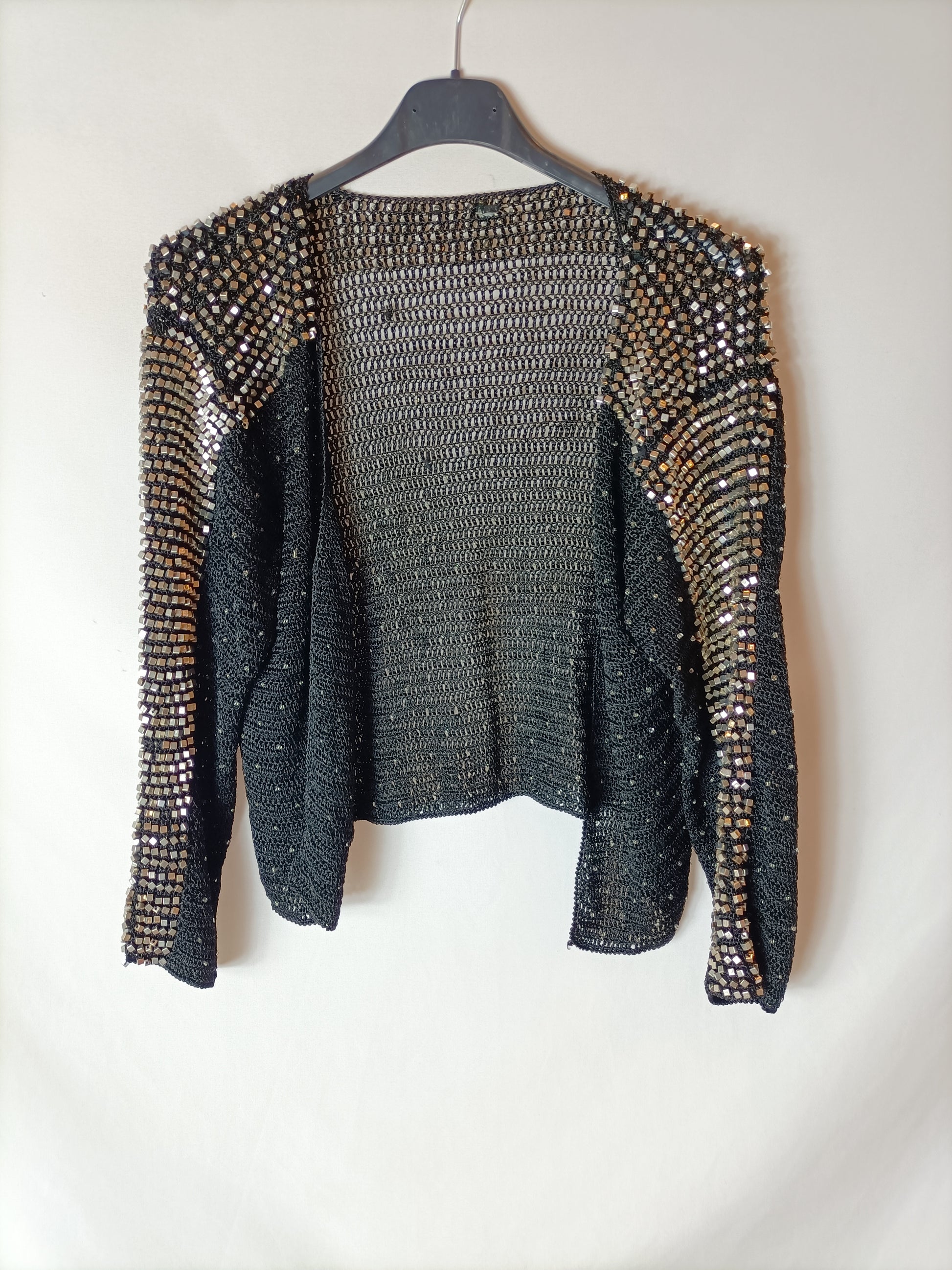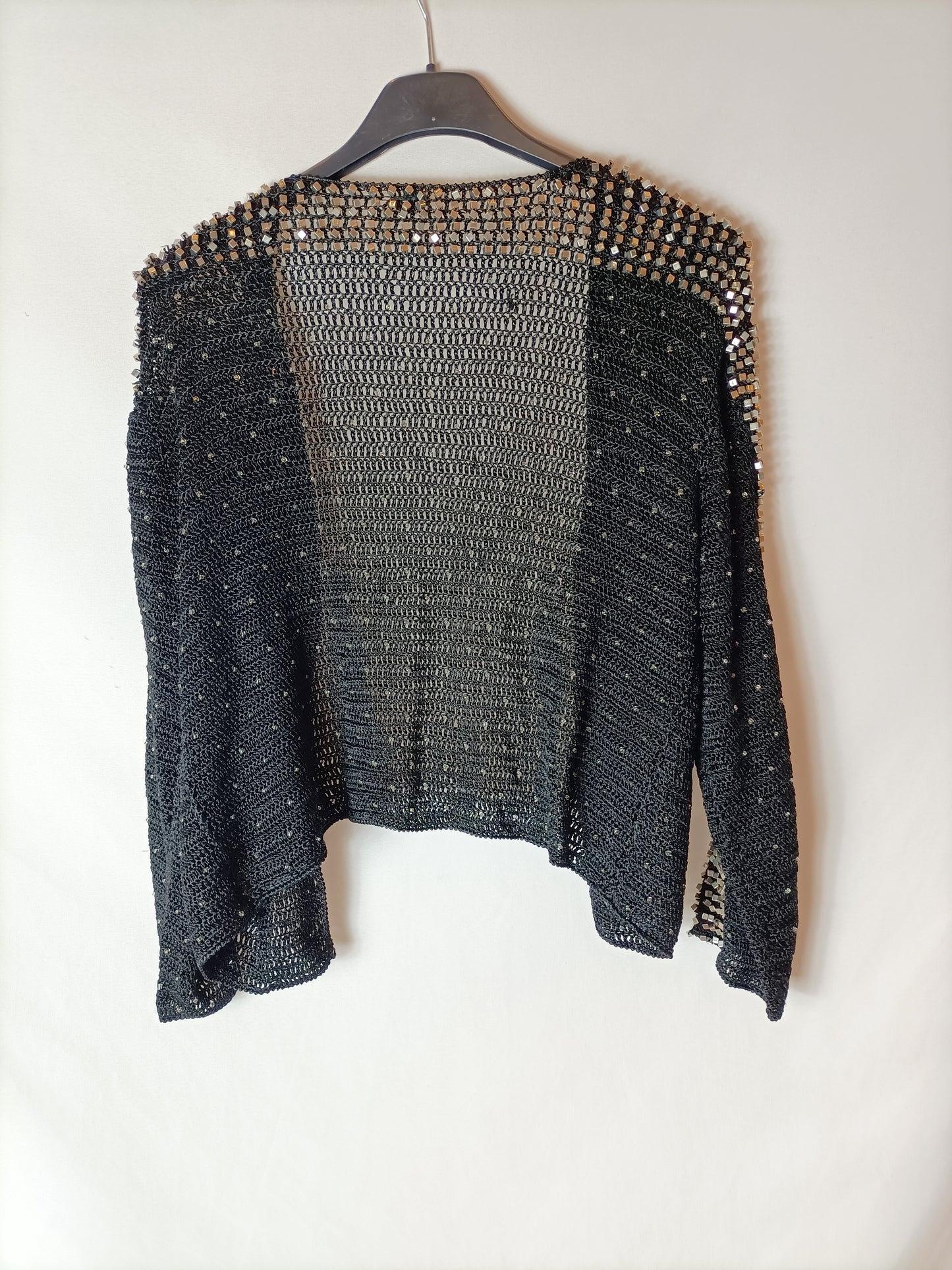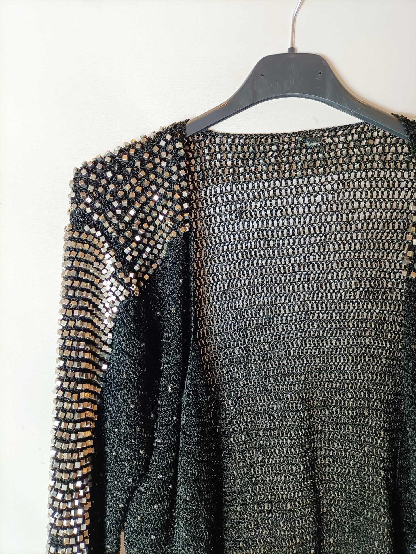 rebeca negra de punto abierto con detalle de abalorios plateados en las mangas.