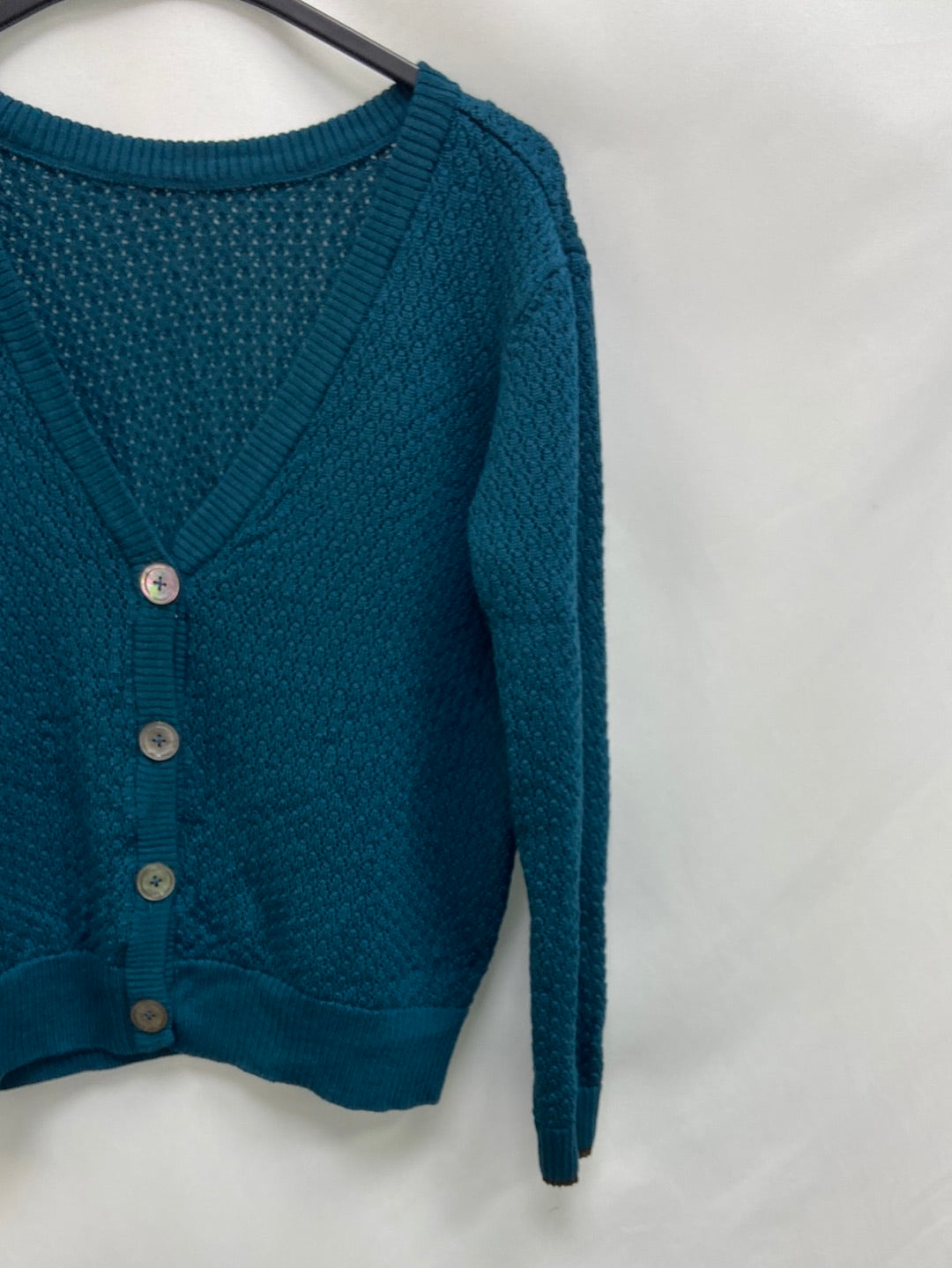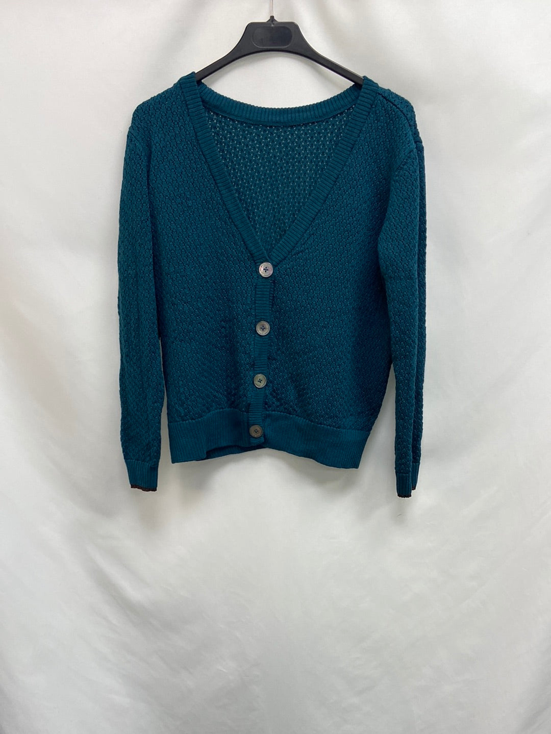 Rebeca verde azulado troquelada y abotonada. largo 54 cm