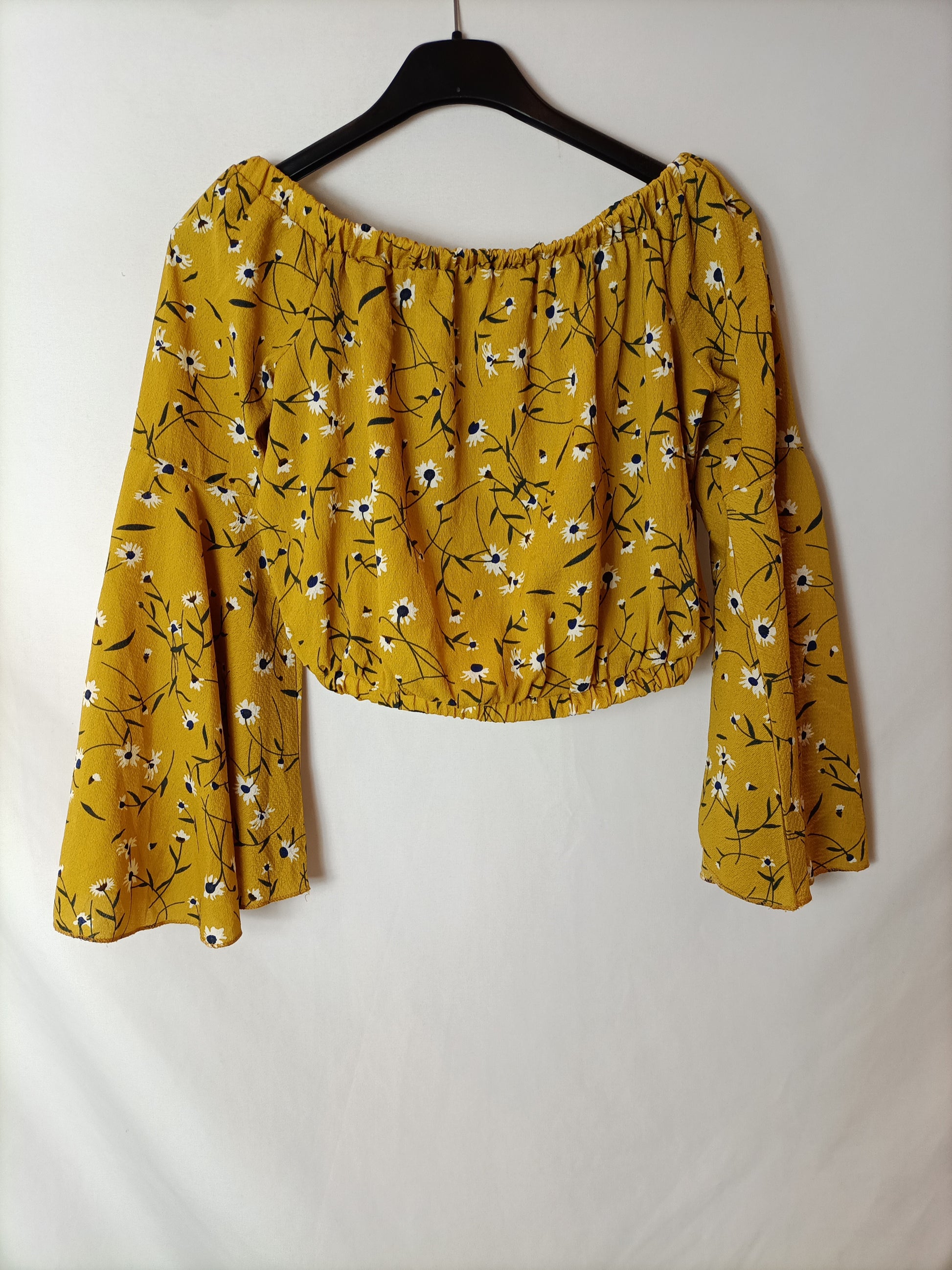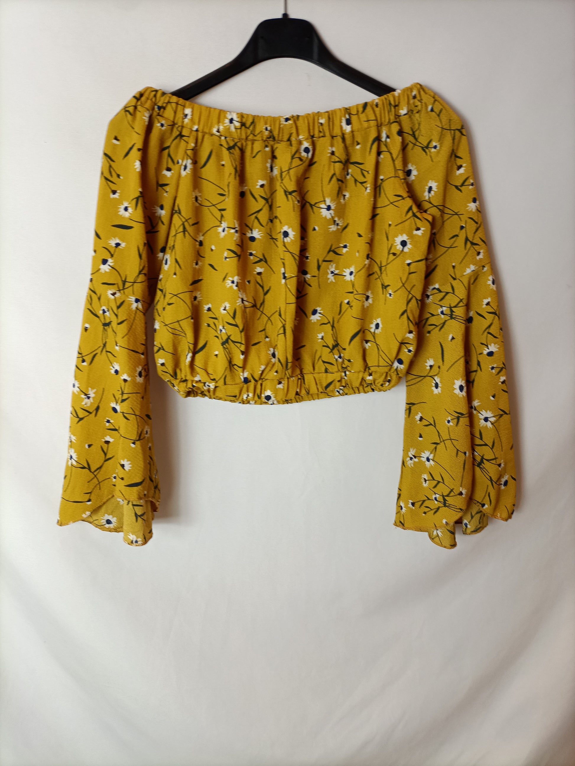 top amarillo flores cintura y cuello elástico. largo 46 cm