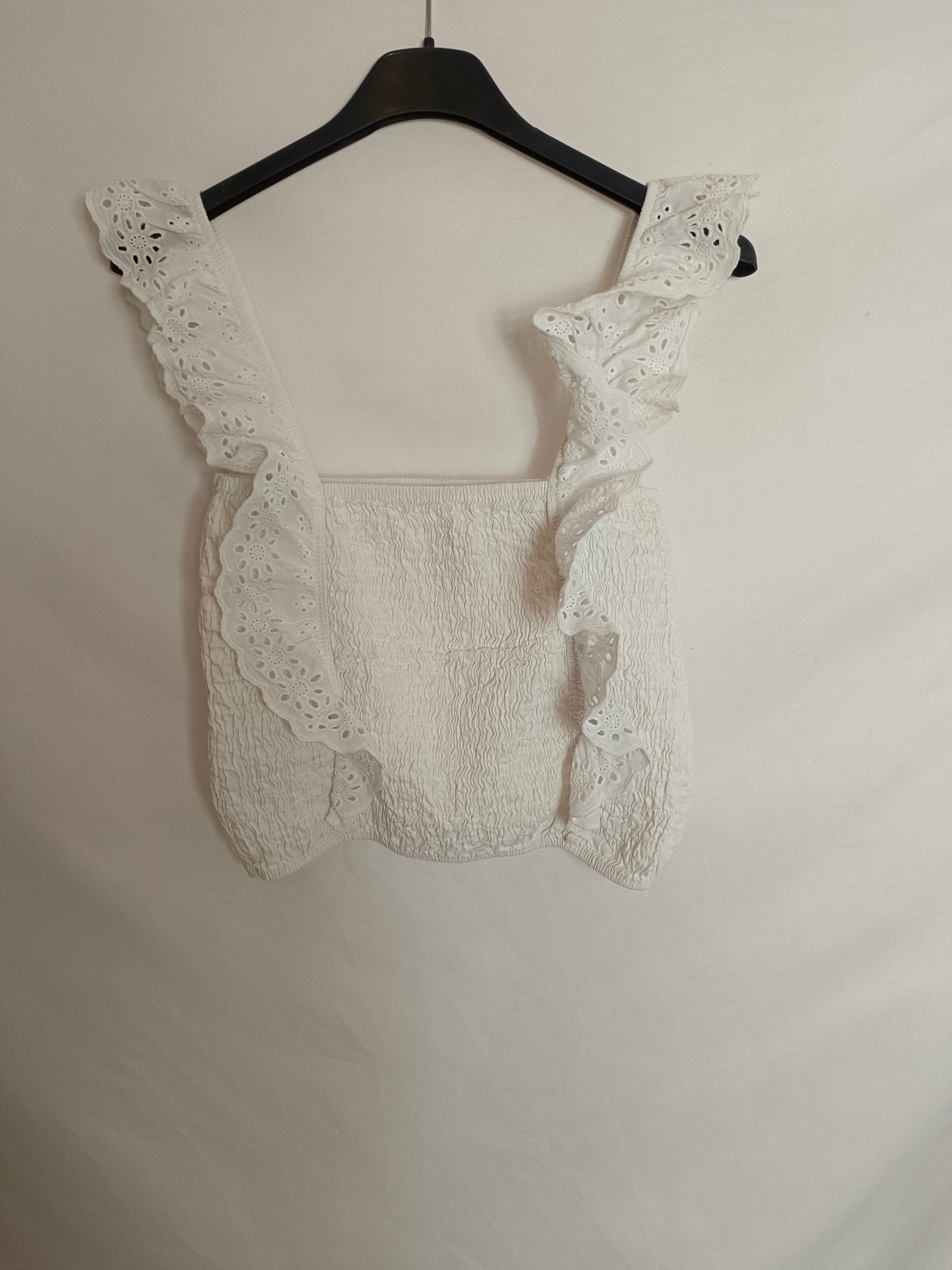 Top blanco de nido de abeja elástico con tirantes efecto volante troquelado. 100%algodón