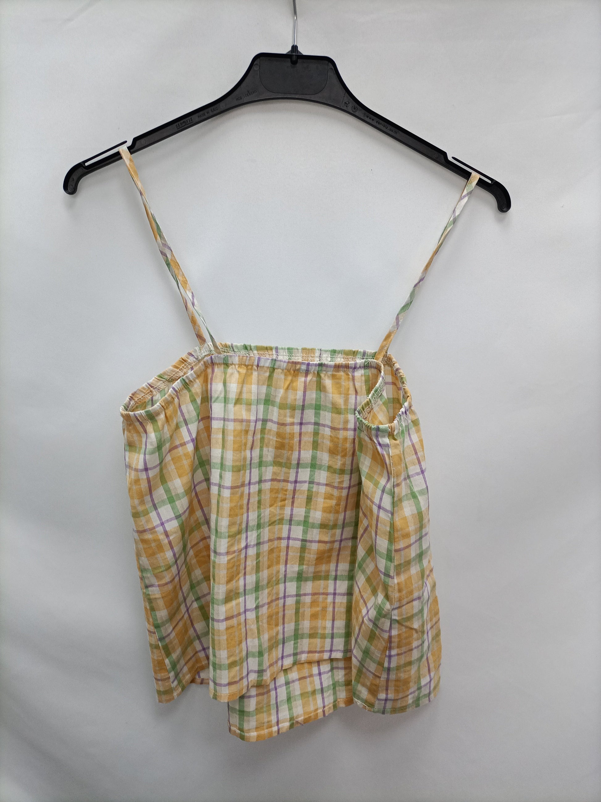Top de tirantes de cuadros en tonos amarillos, verdes y morados. Escote elástico. largo 55 cm