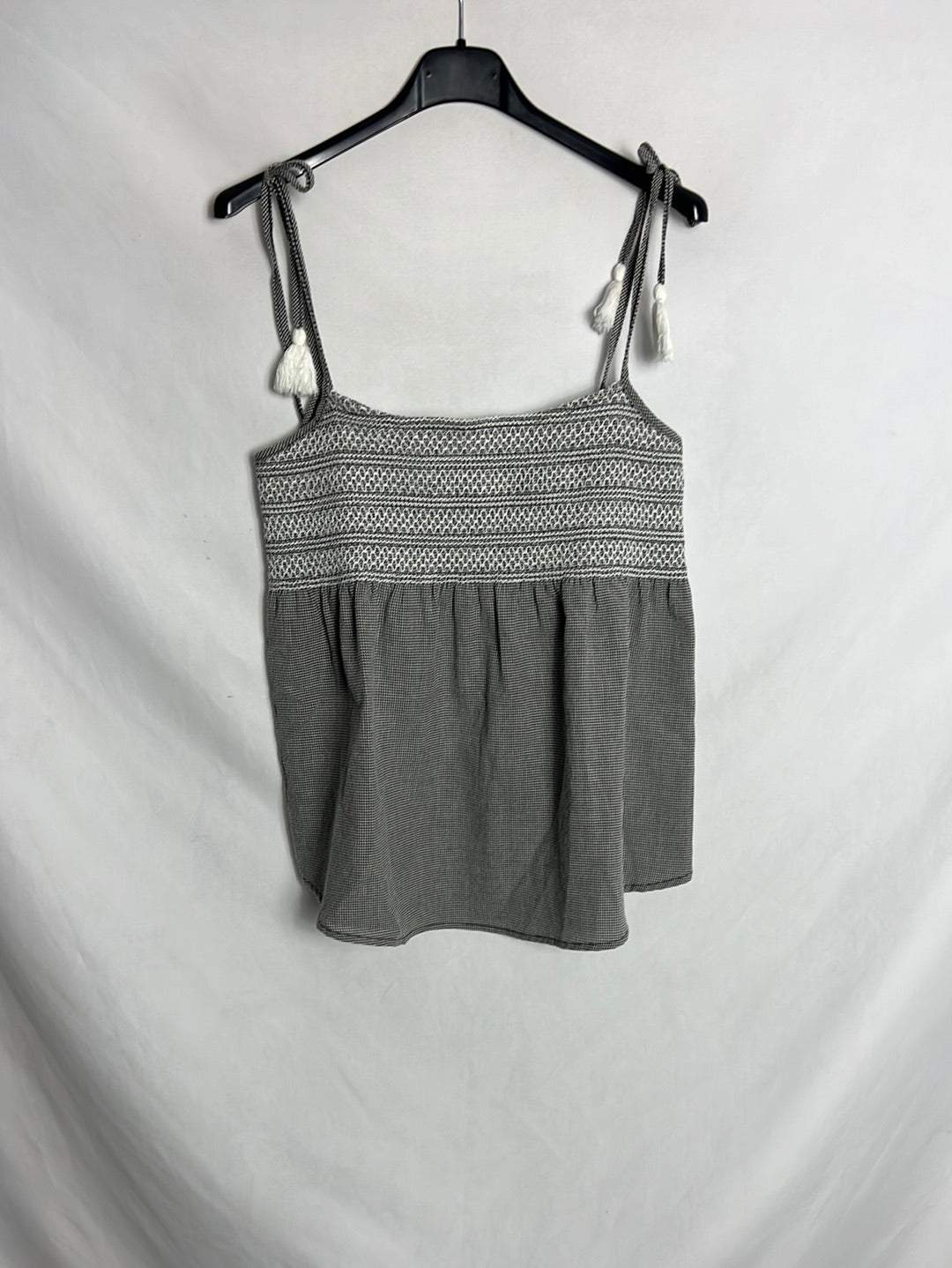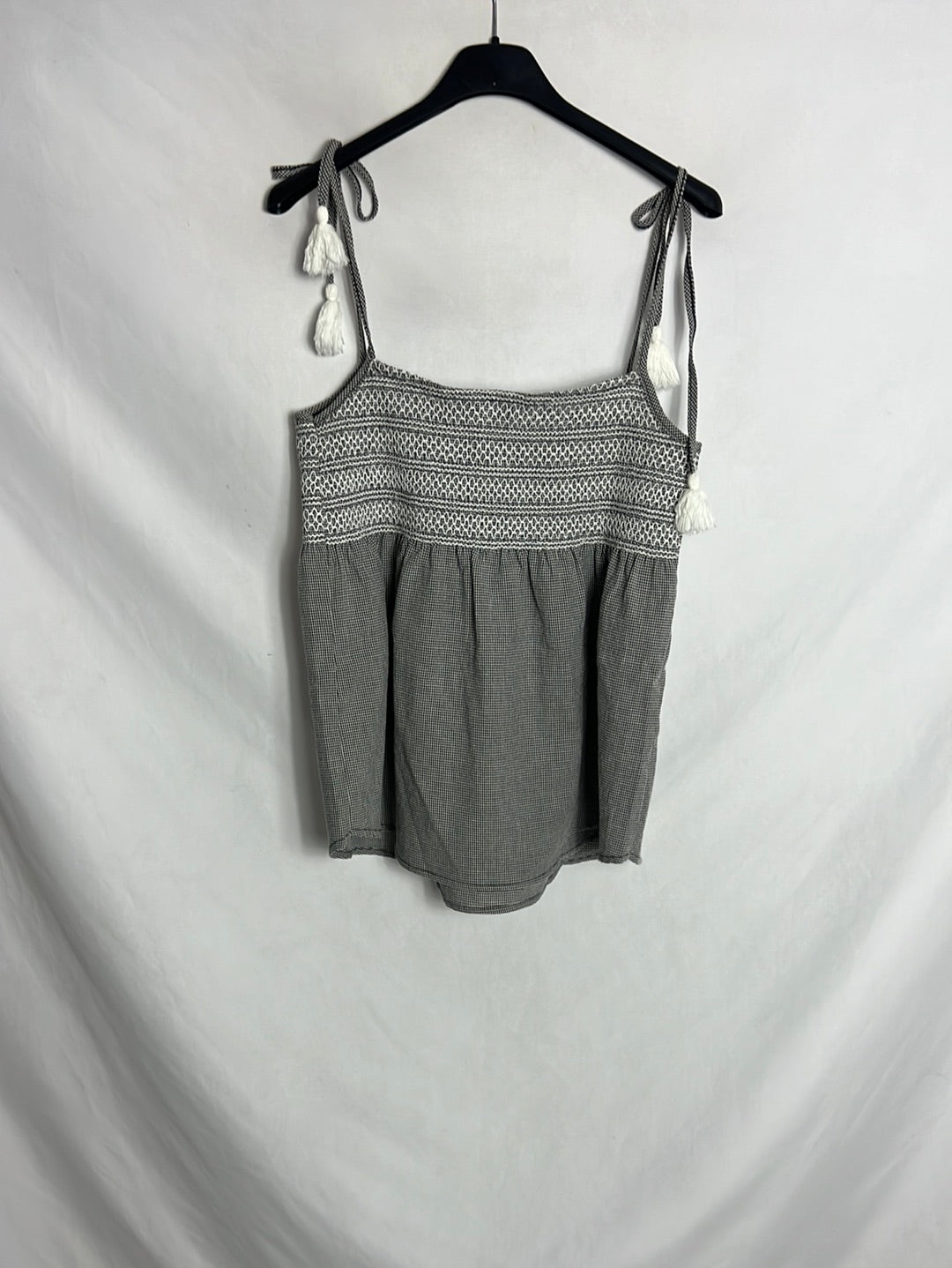 top de cuadros vichí con escote bordado de nido de abeja. Tirantes ajustables.