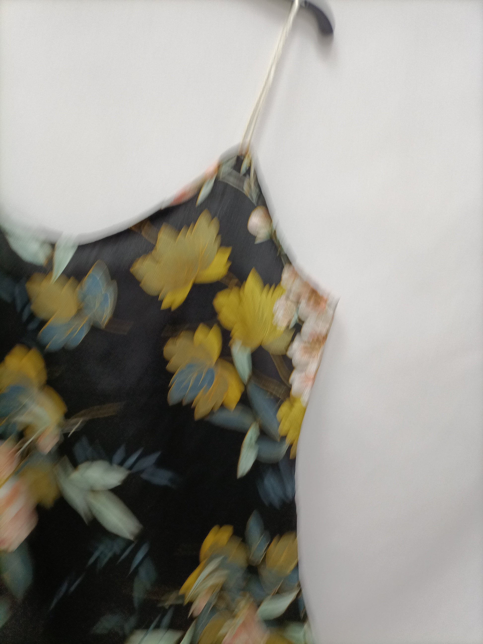 Top negro fluido con estampado de hojas. No elástica. Detalle de botones en la espalda. De sisa a sisa 46 largo 63 cm