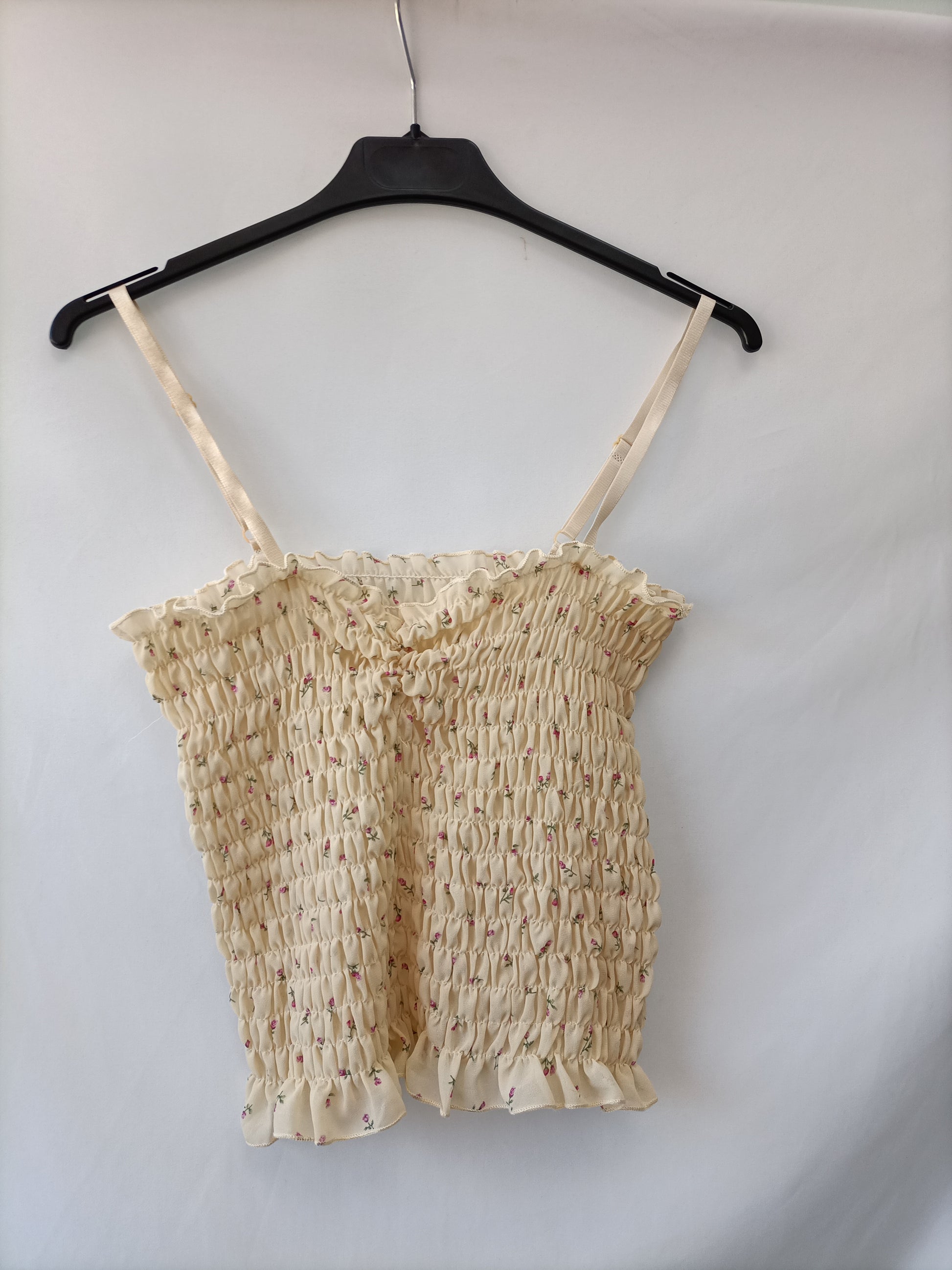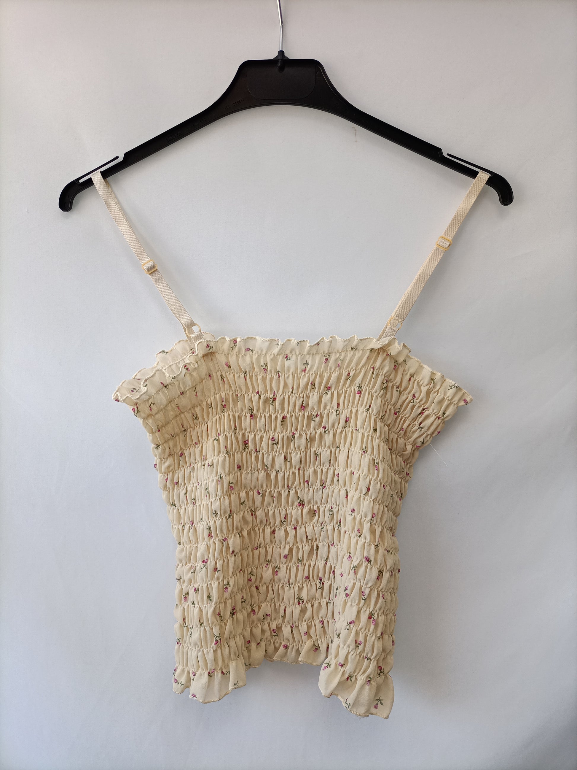 Top beige con flores elástico de nido de abejas. Largo 31 cm