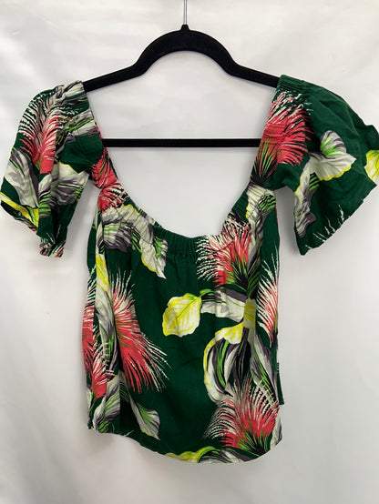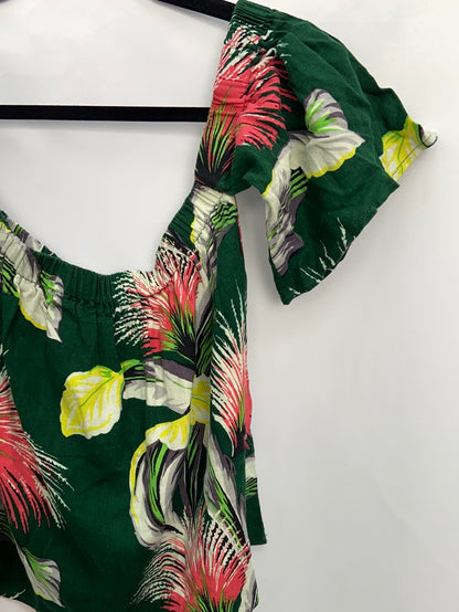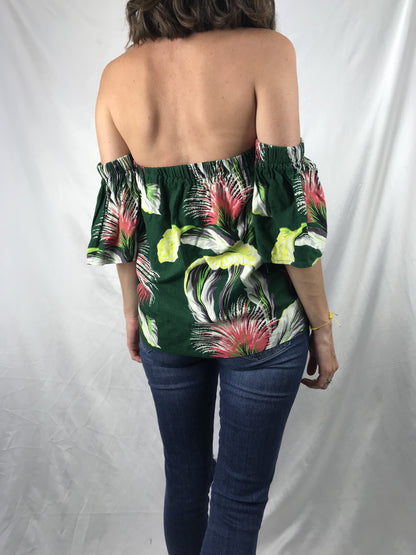 Top hombros descubiertos con mangas ajustadas. Estampados palmeras de colores.