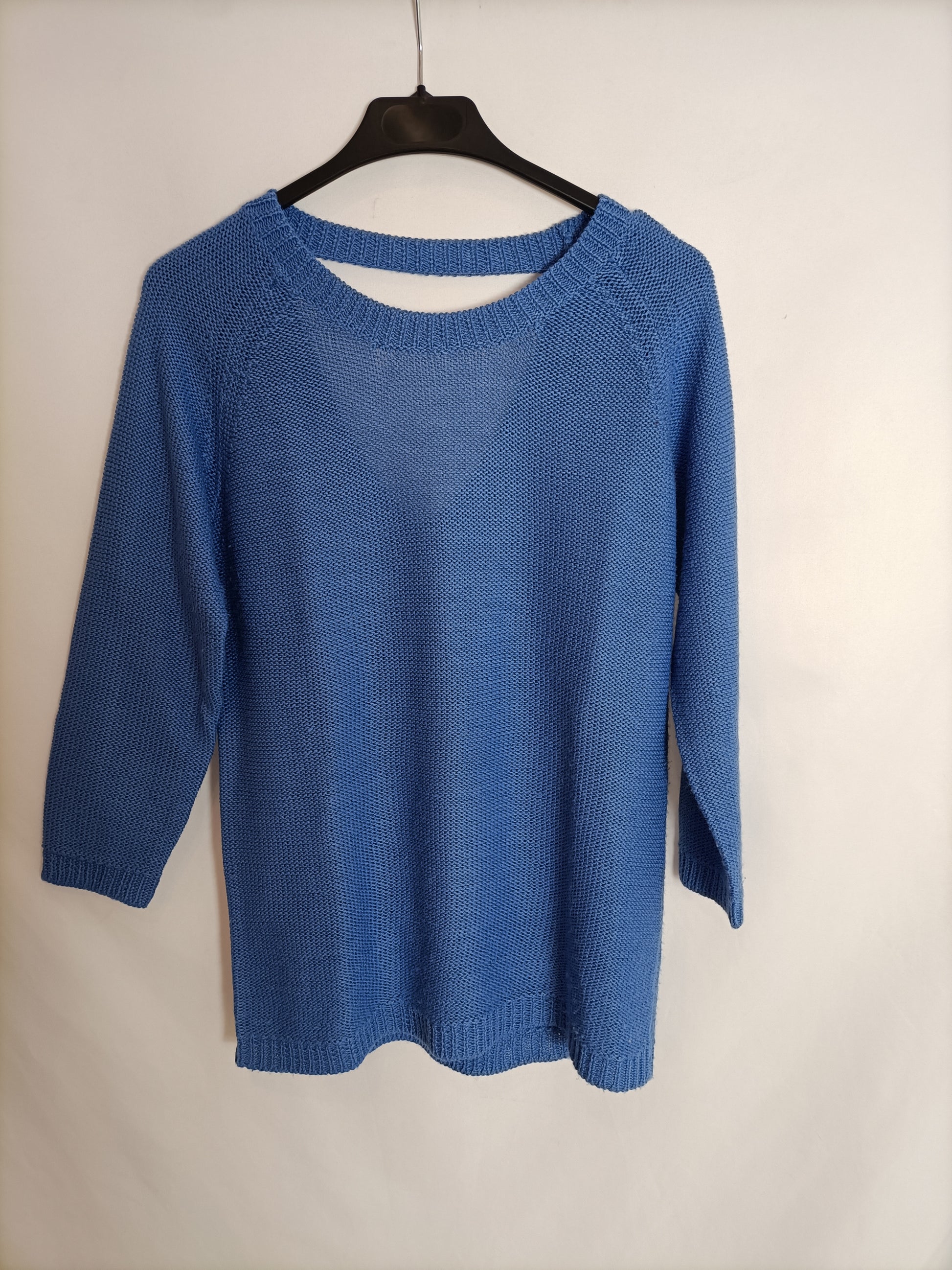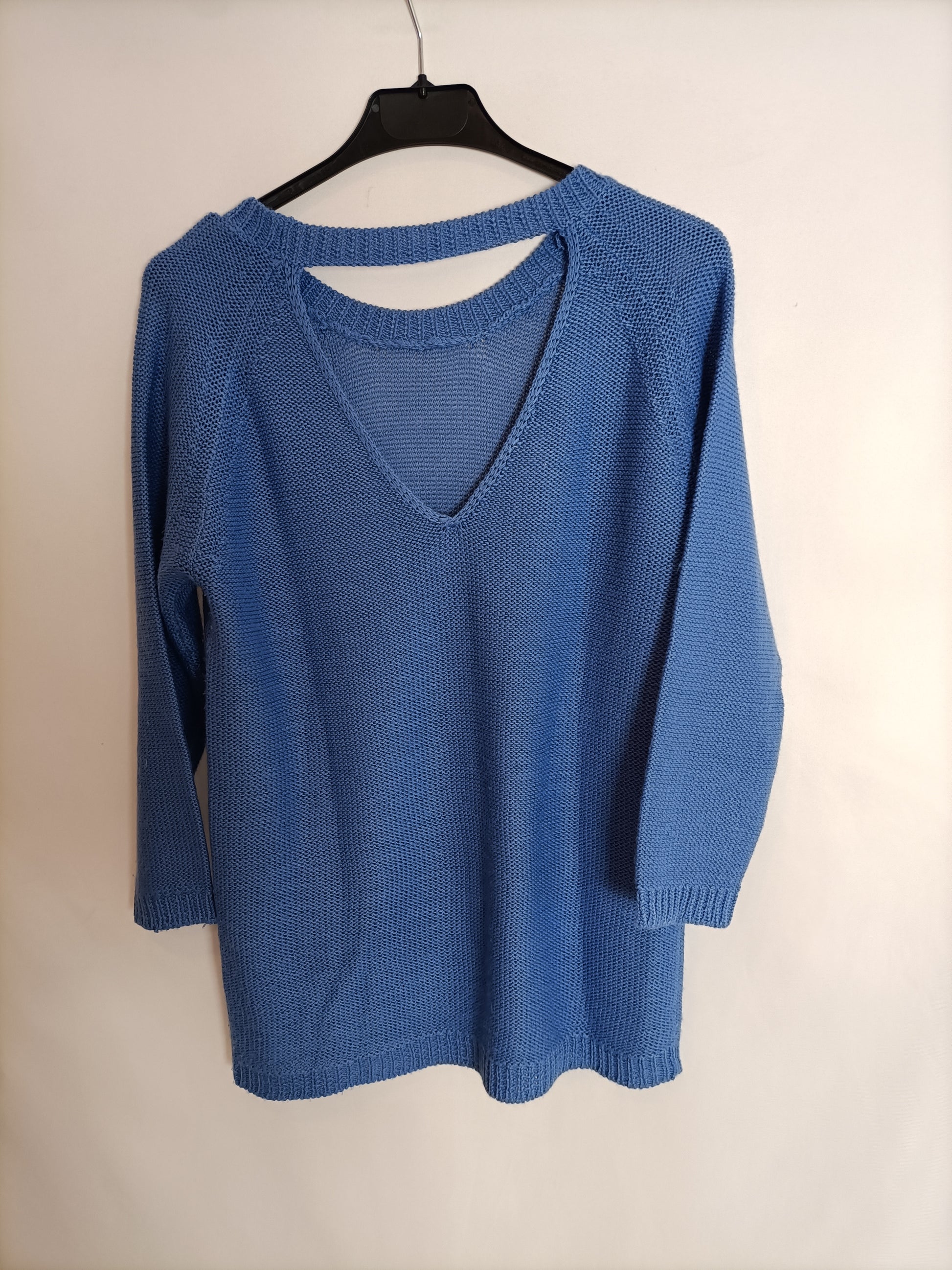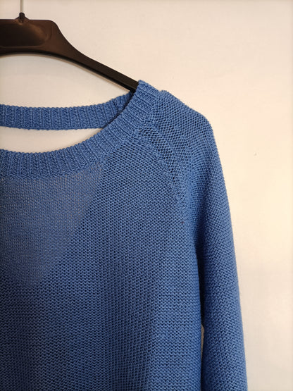 top de punto celeste con escote o espalda efecto choquer. se puede poner de ambas formas