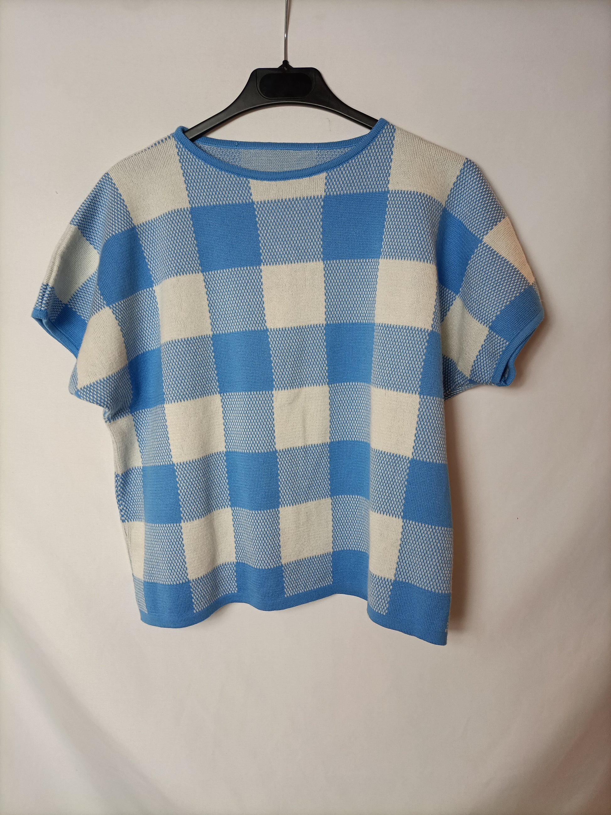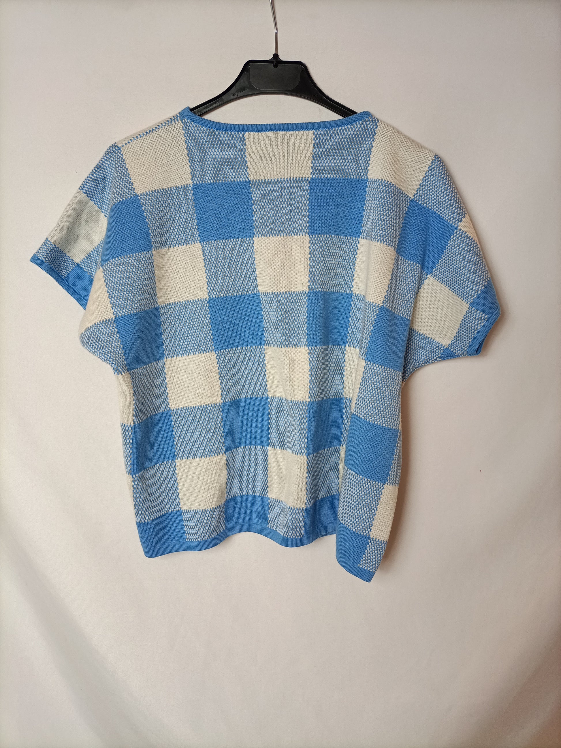 top de punto de cuadros beige y azul.