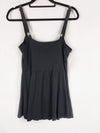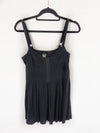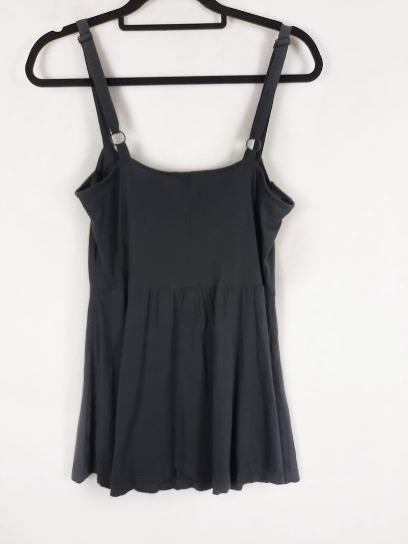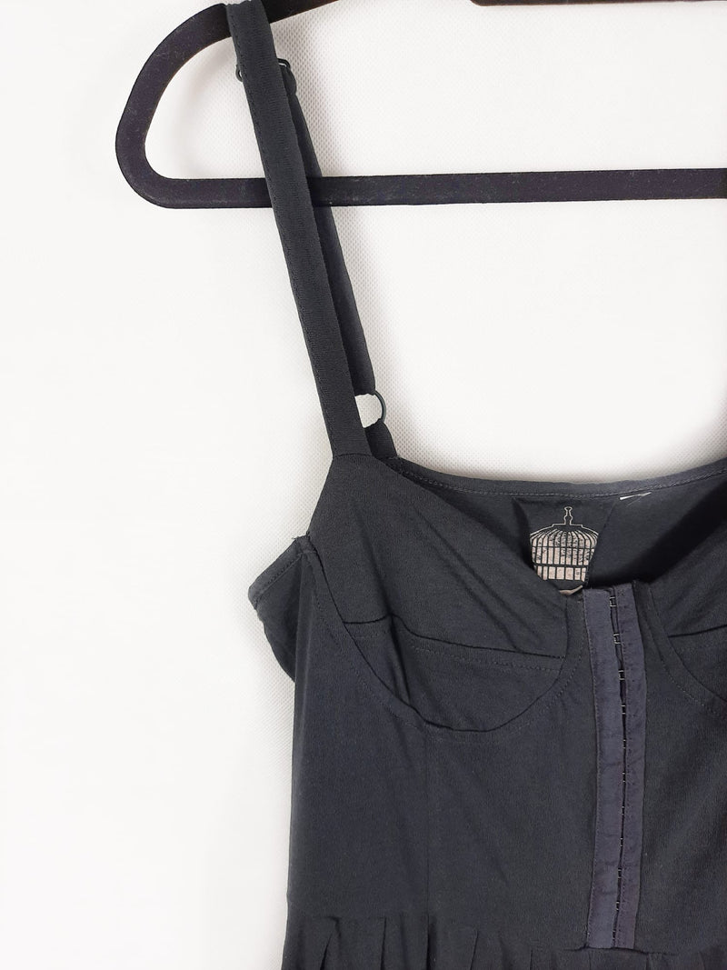 Vestido gris con la parte de arriba tipo corsé con corchetes. Es elástico y fluido. Tirantes ajustables. Largo 81 cm