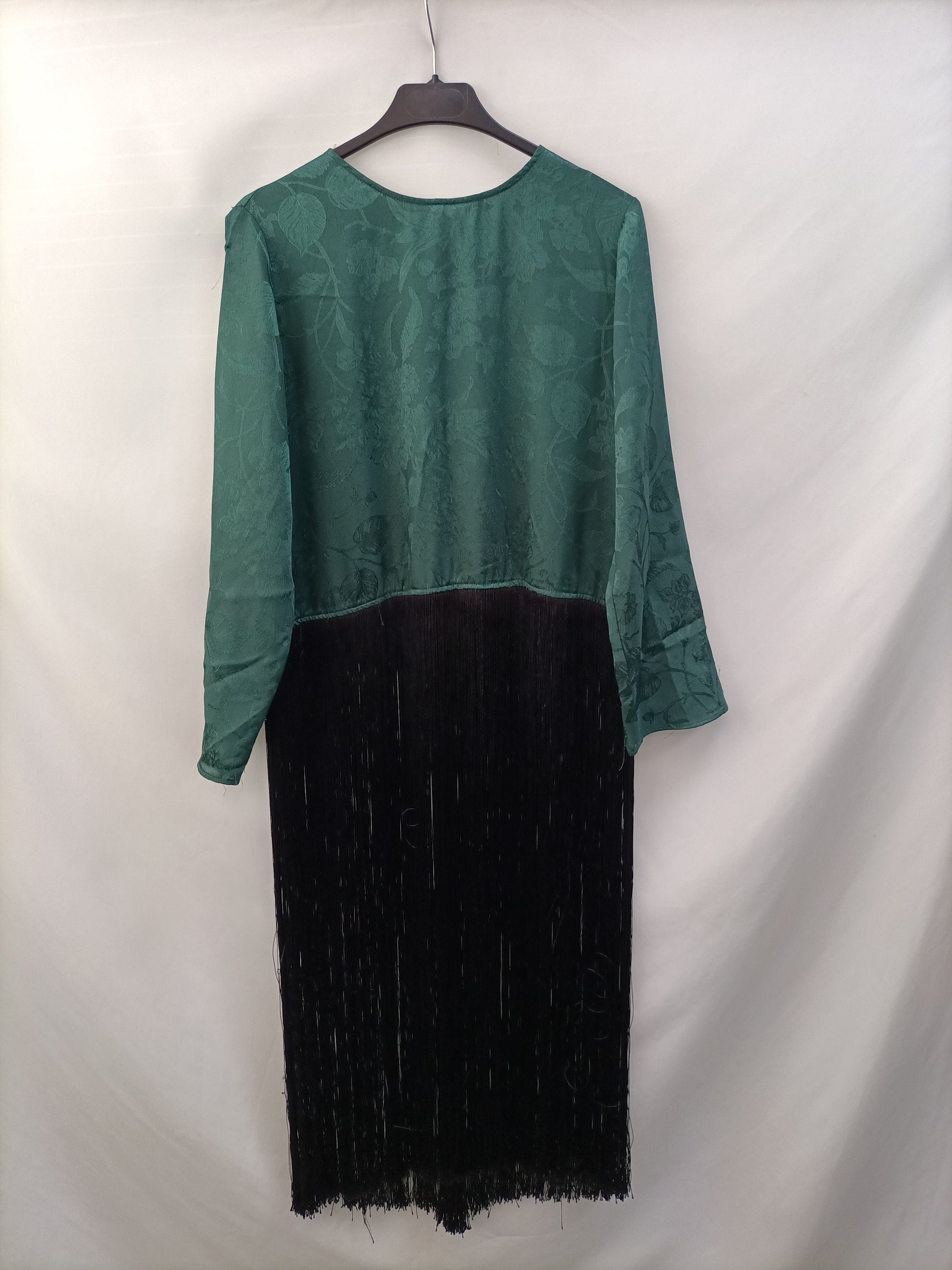 top estampado monocromático en verde oscuro con flecos . De sisa a sisa 49cm largo 45/116 cm