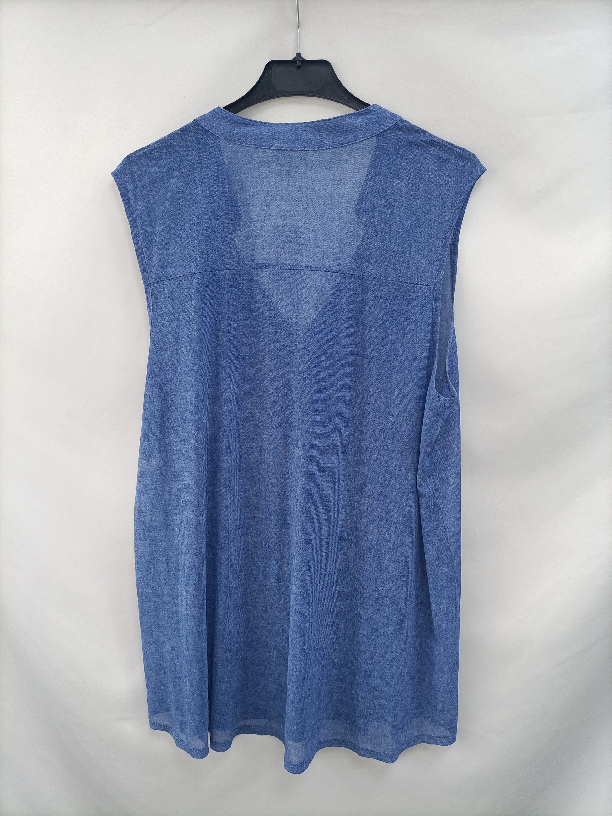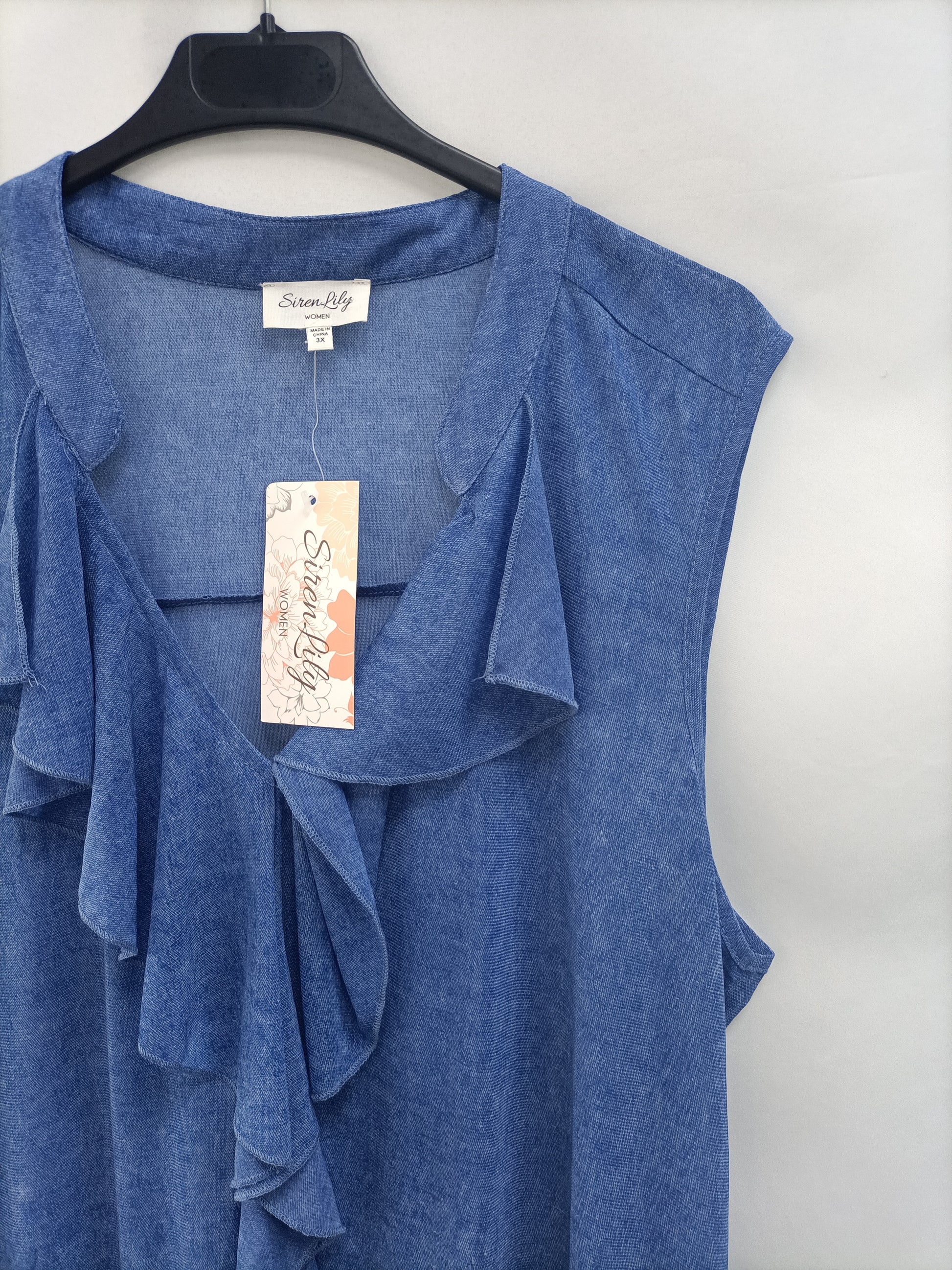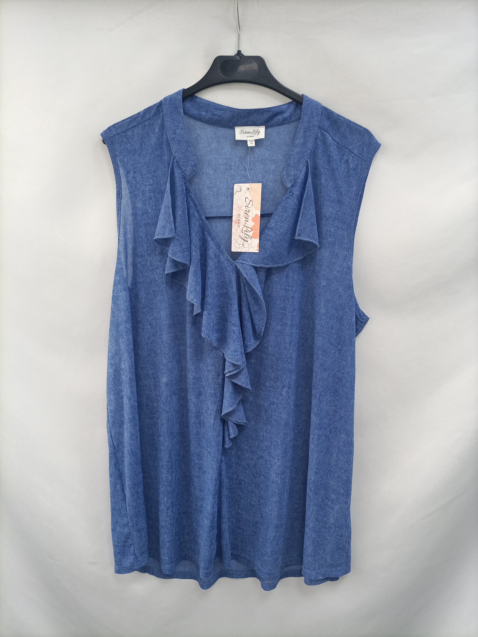 Top azul fluido con un volante en el escote y parte delantera, es finito y un poco transparentoso. NUEVO CON ETIQUETA