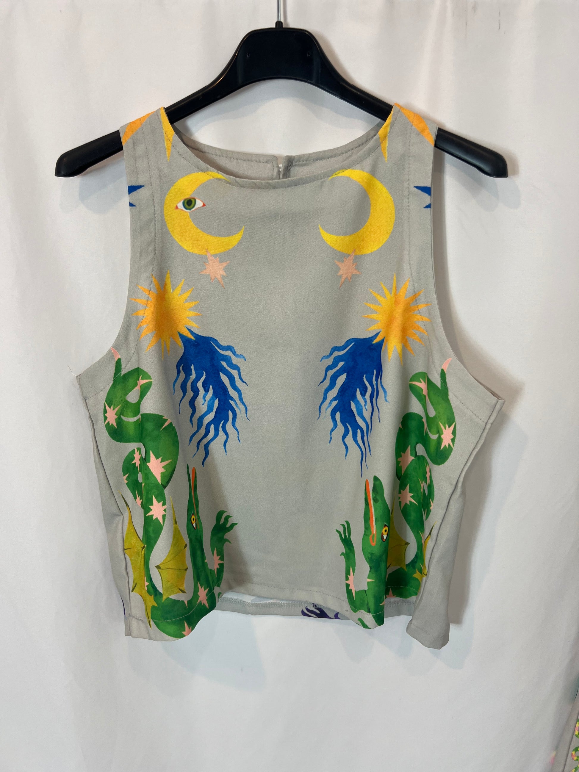 total look pantalón y top en tonos gris ambas cosas fluida con estampado colorido