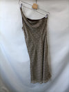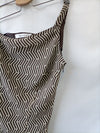 Vestido de rayas beige y negro ajustado de tejido tipo seda. Se abrocha con cremallera lateral.