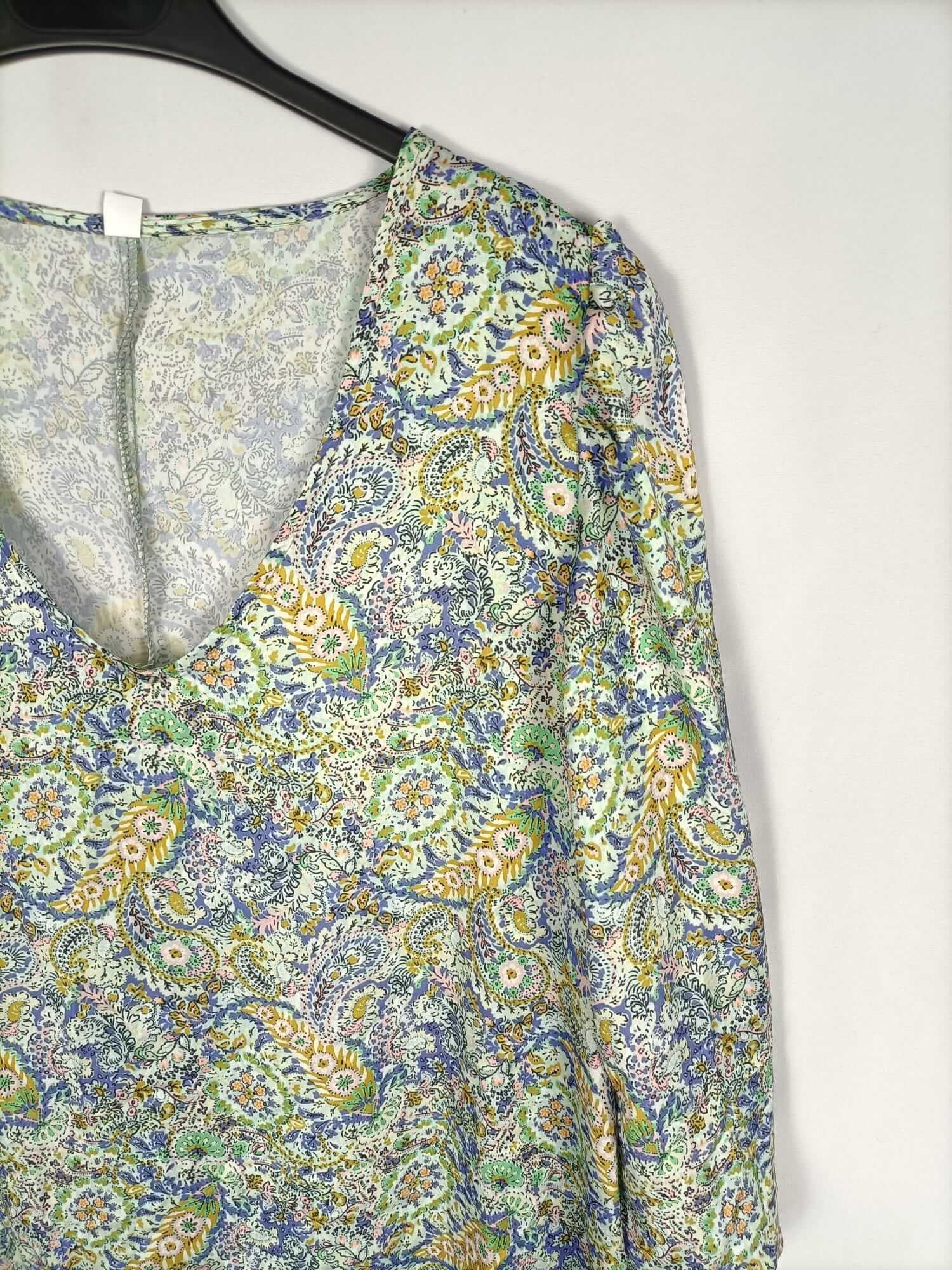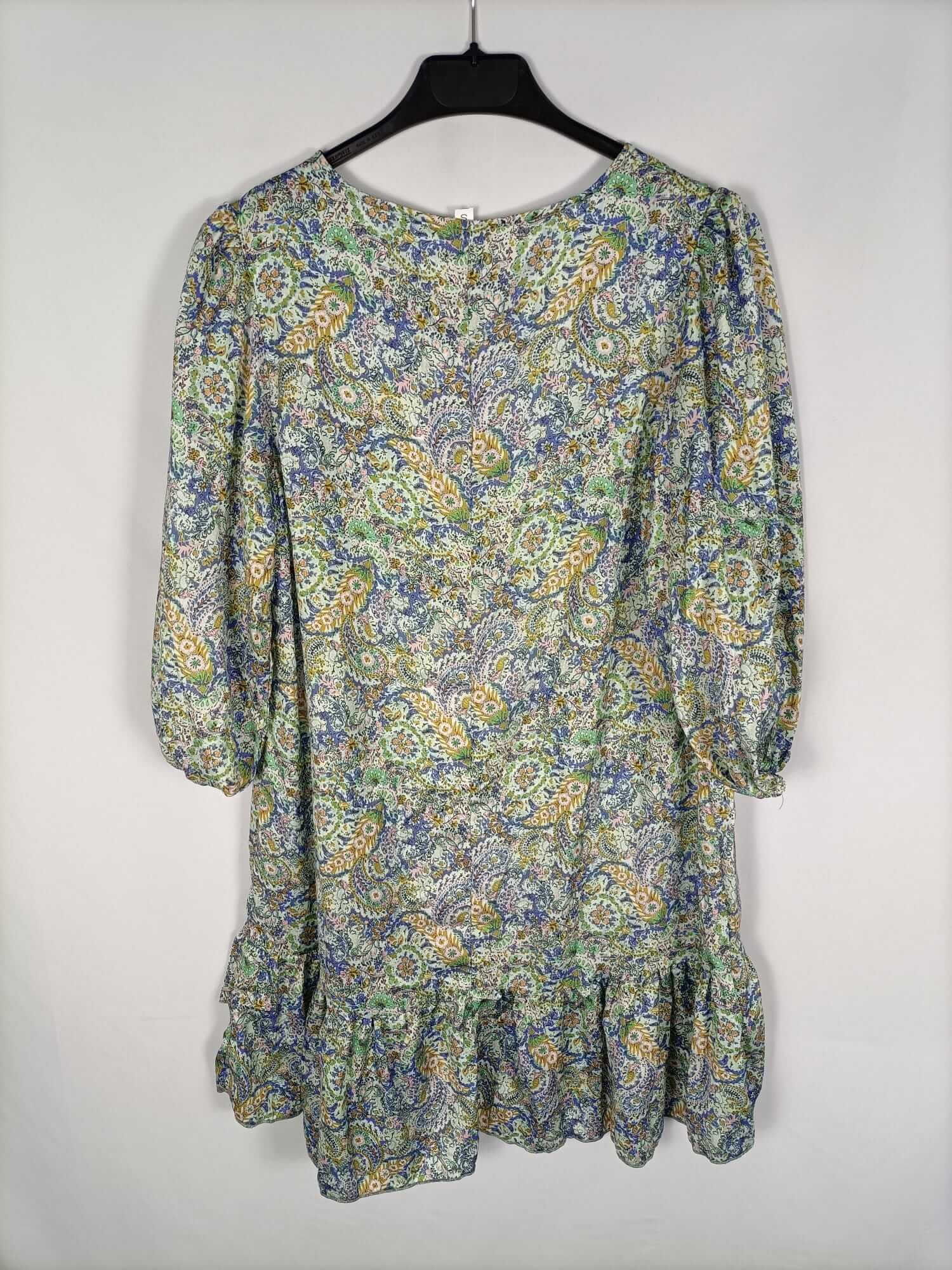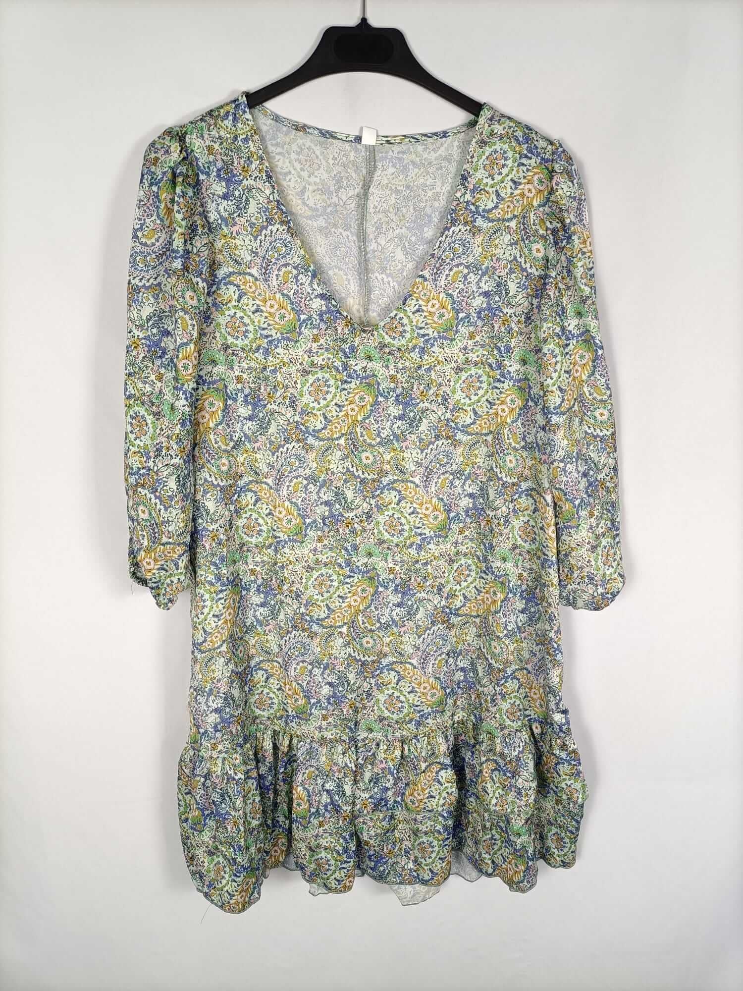 Otras.s. vestido corto fluido con estampado de ambas y flores. Mangas ligeramente abullonadas y volantes en la parte de abajo. No elástico. De sisa a sisa 44 cm largo 89 cmv