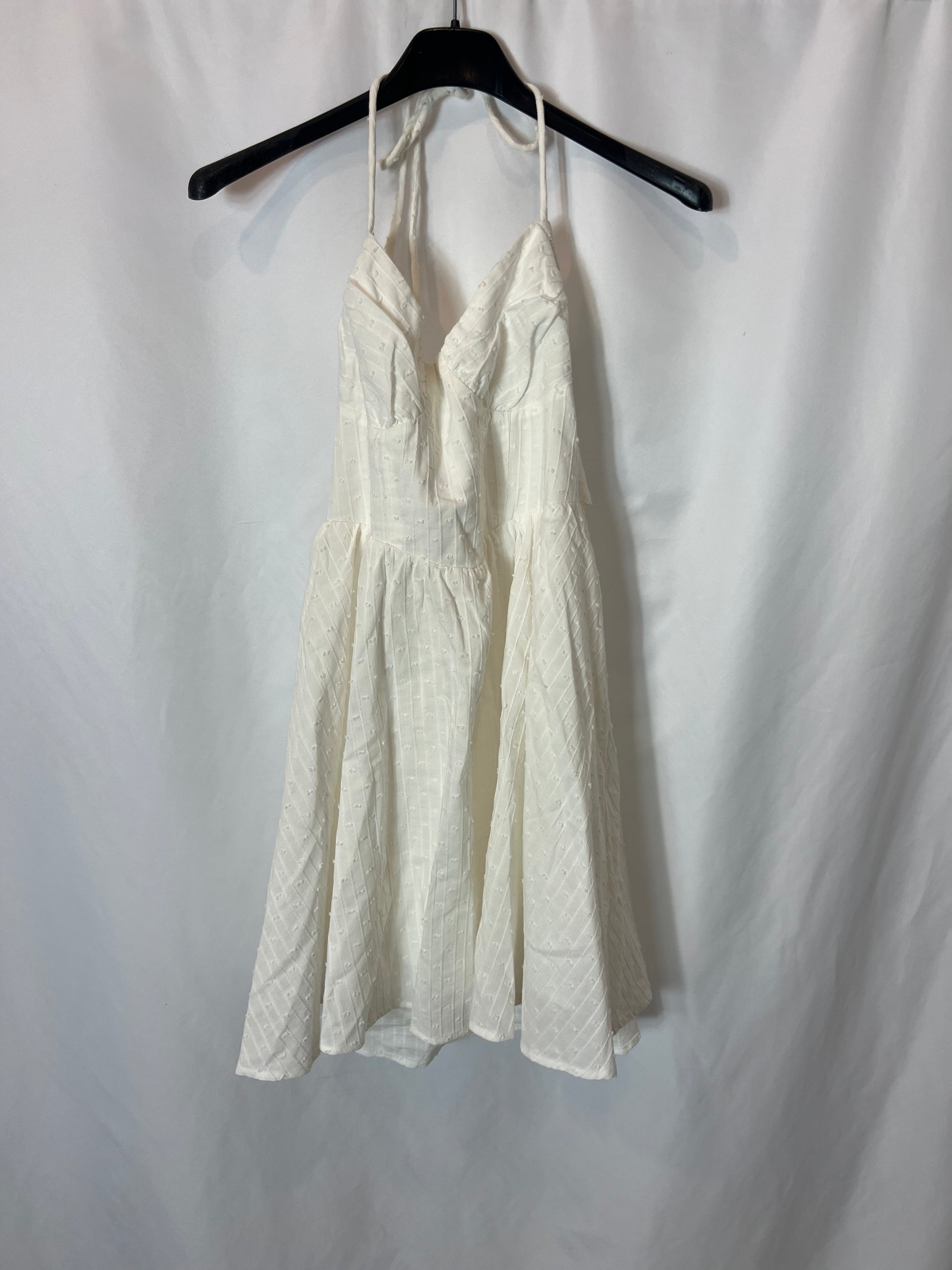vestido corto blanco de plumeti atado al cuello. Espalda elástica