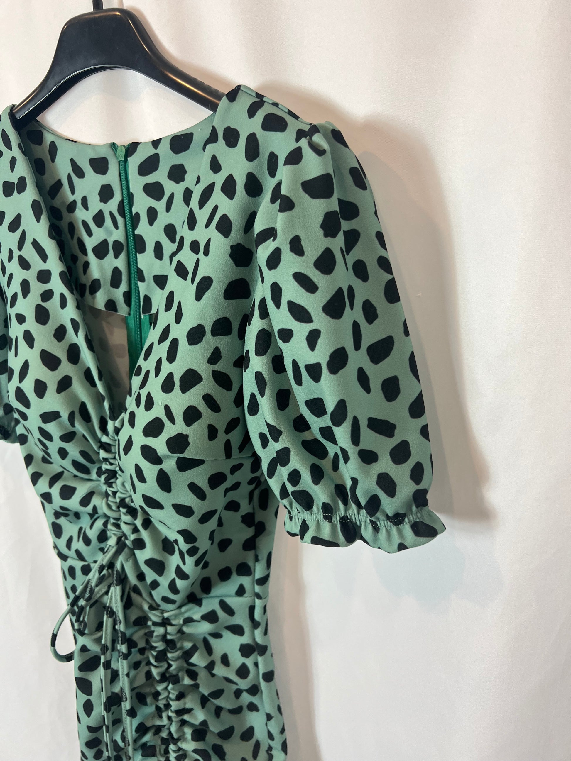 Vestido corto verde fruncido con estampado animal print . Largo 87cm