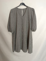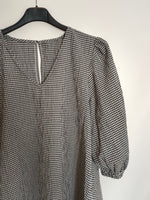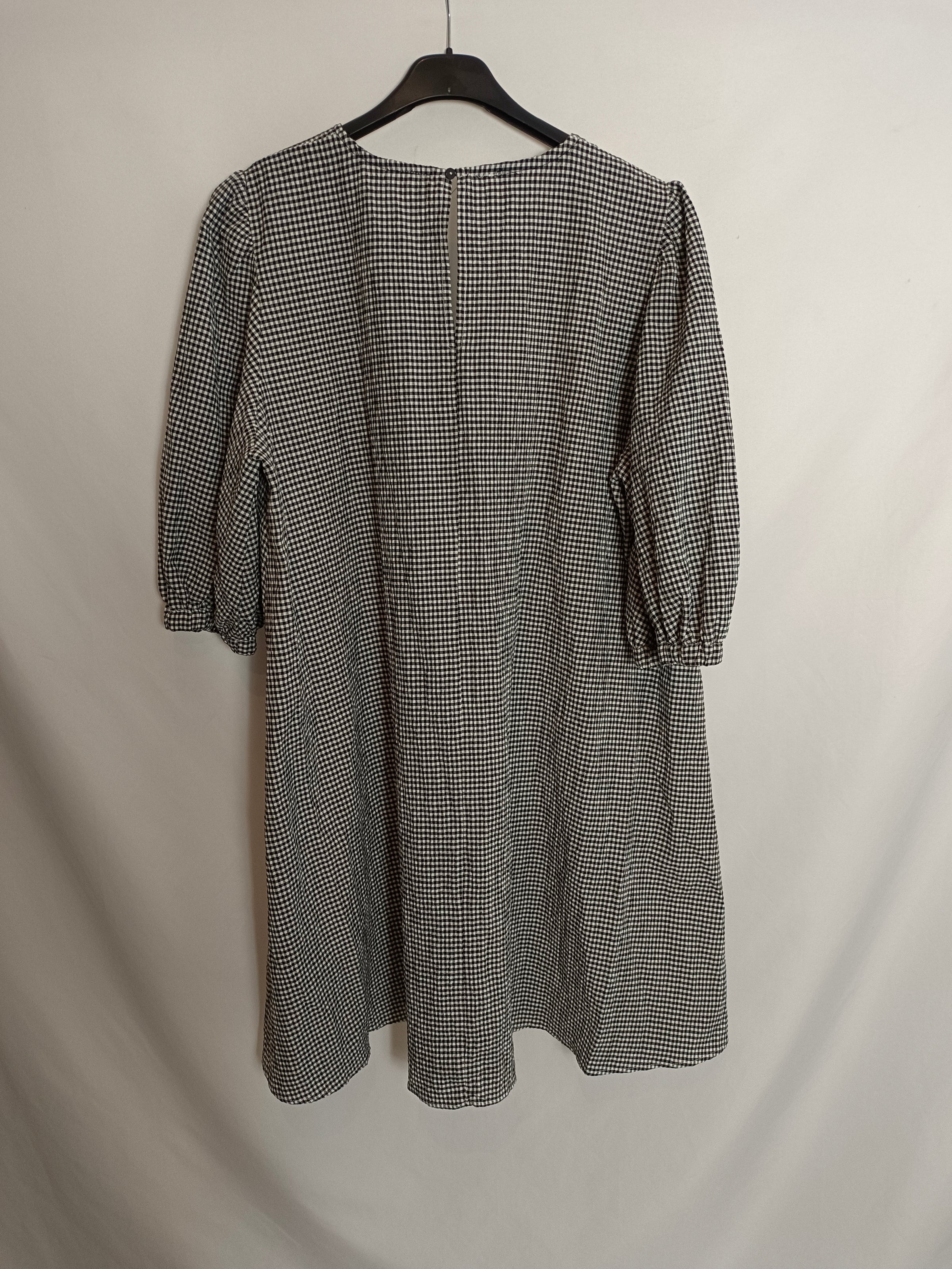 vestido corto de cuadros vichí negro y blanco. Mangas ligeramente abullonadas