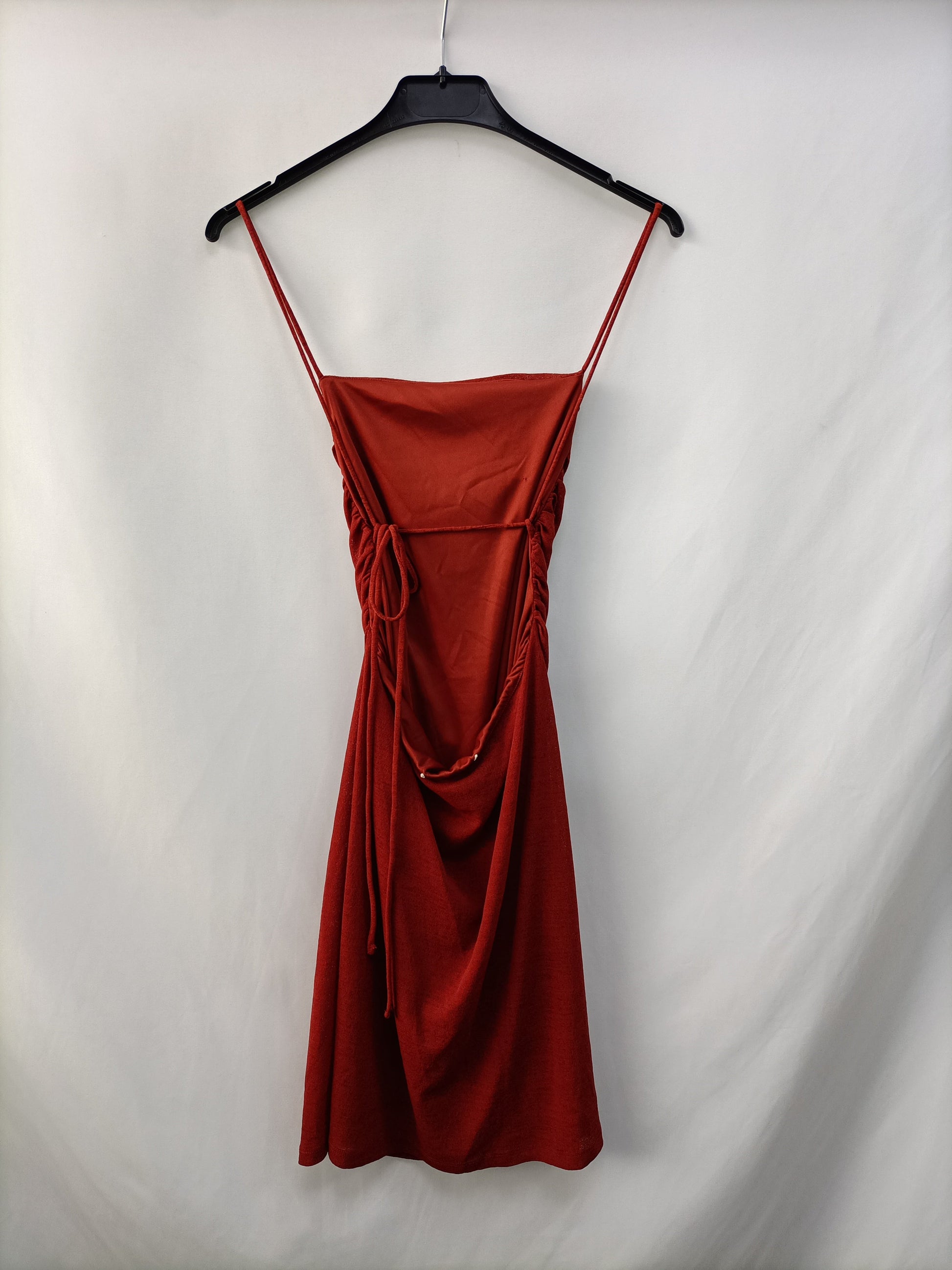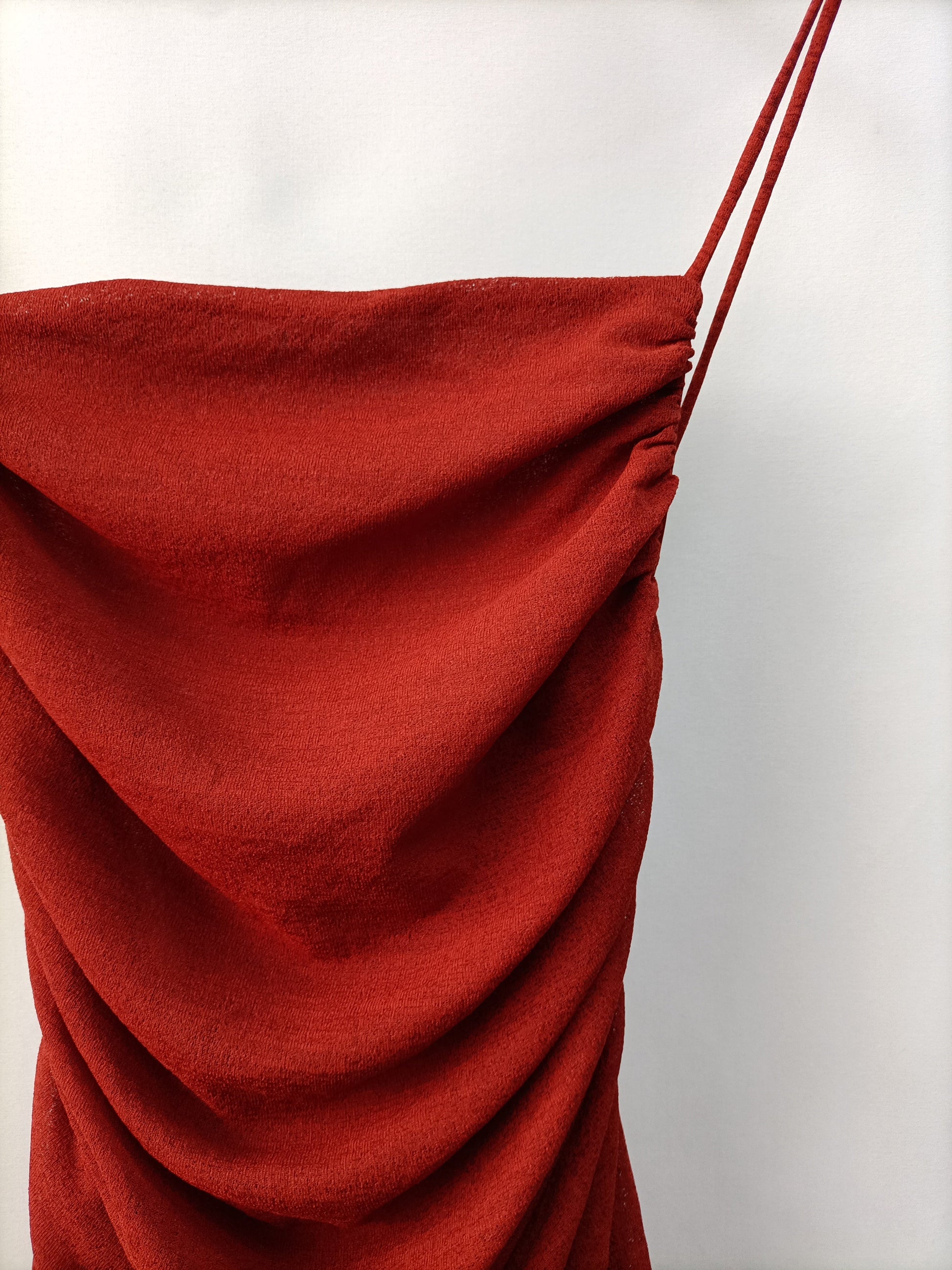 vestido corto jaspeado color teja con la espalda al aire y detalles fruncdos. largo 84 cm