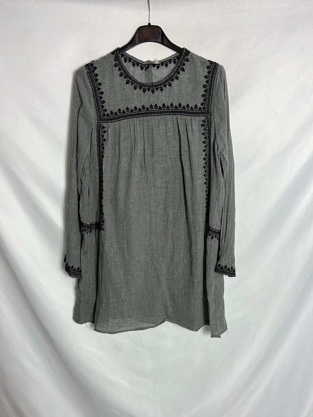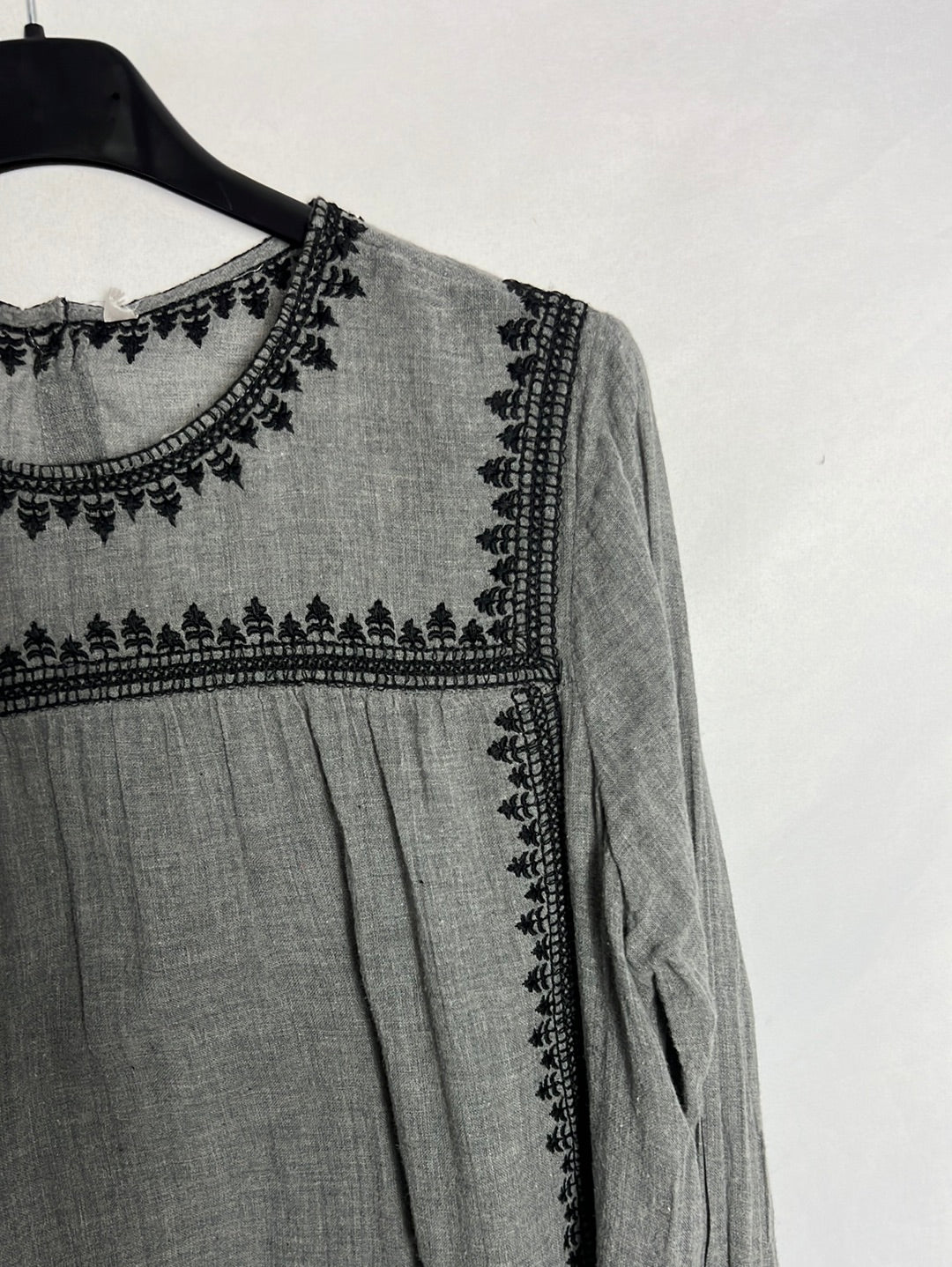 vestido corto gris con detalles bordados. Fluido. No elástico. hombros 36cm, largo 72cm