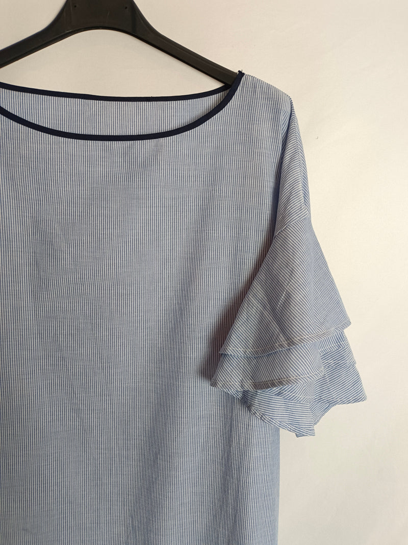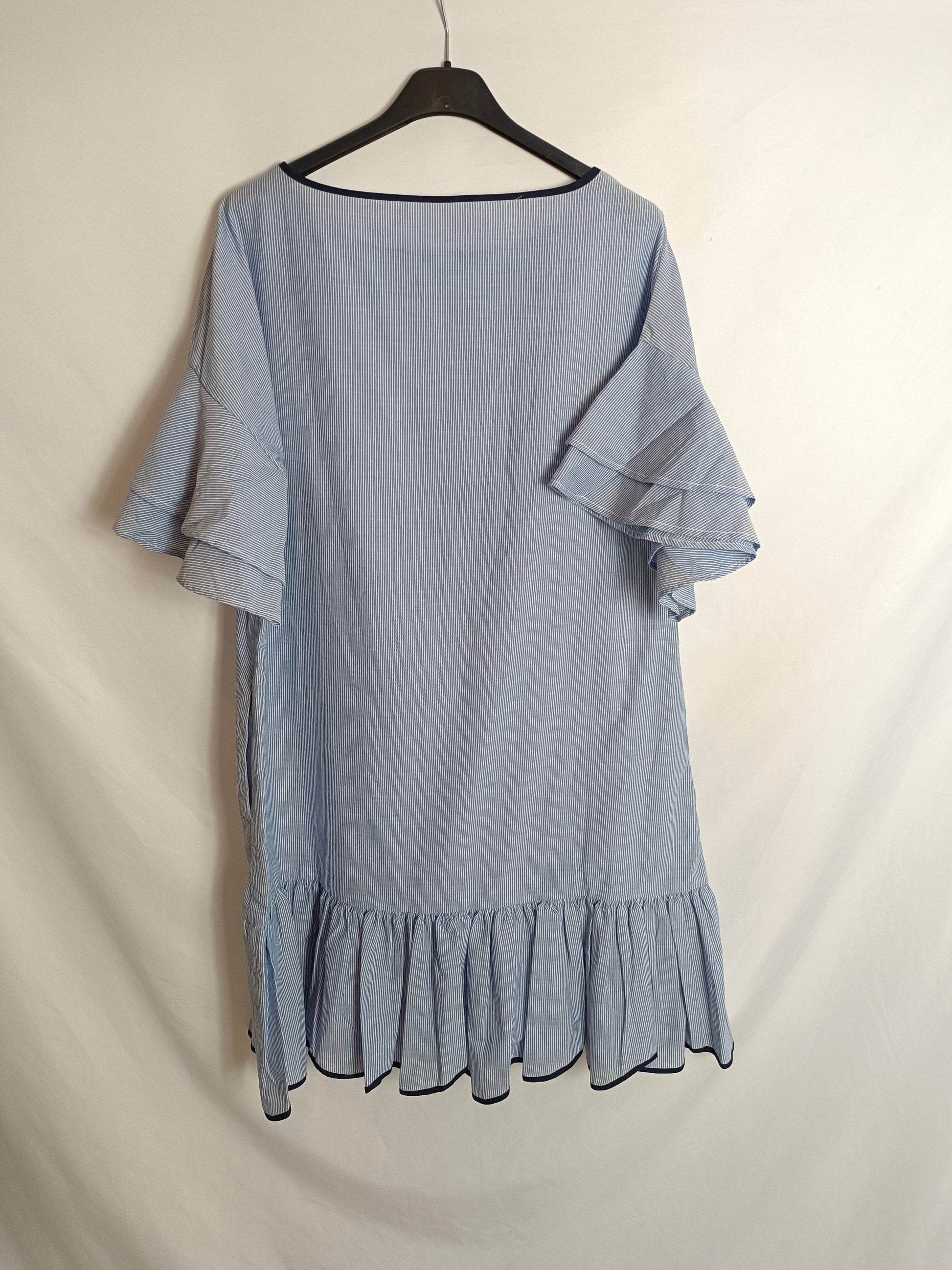 vestido azul cortito y fluido con rayas azul y blanco. volantes en la parte de abajo.
