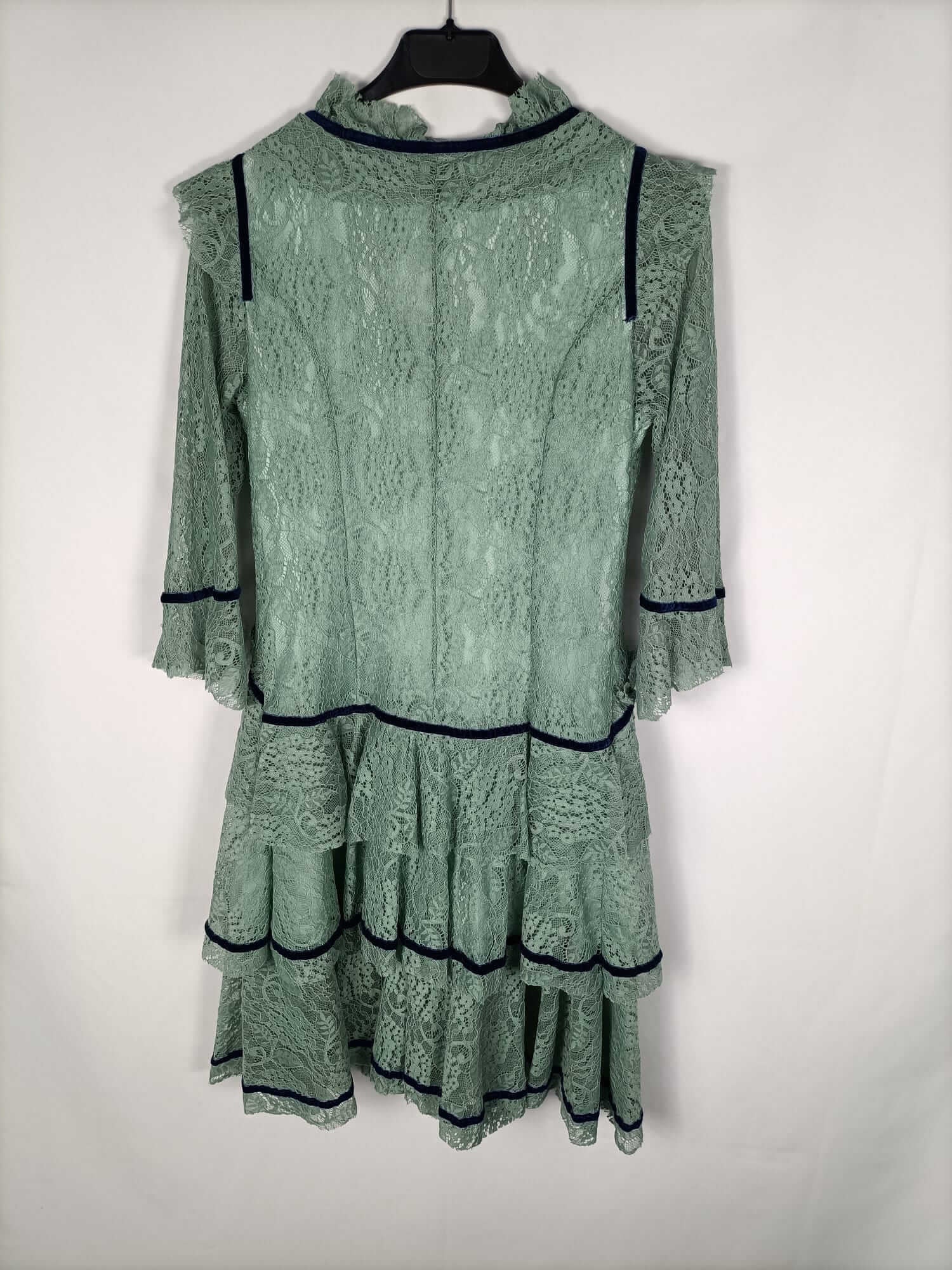 Otras. Tu (s/m). Vestido corto verde de encaje con detalle de tiras de terciopelo y volantes. Elastico. De sisa a sisa 42 cm largo 93 cm