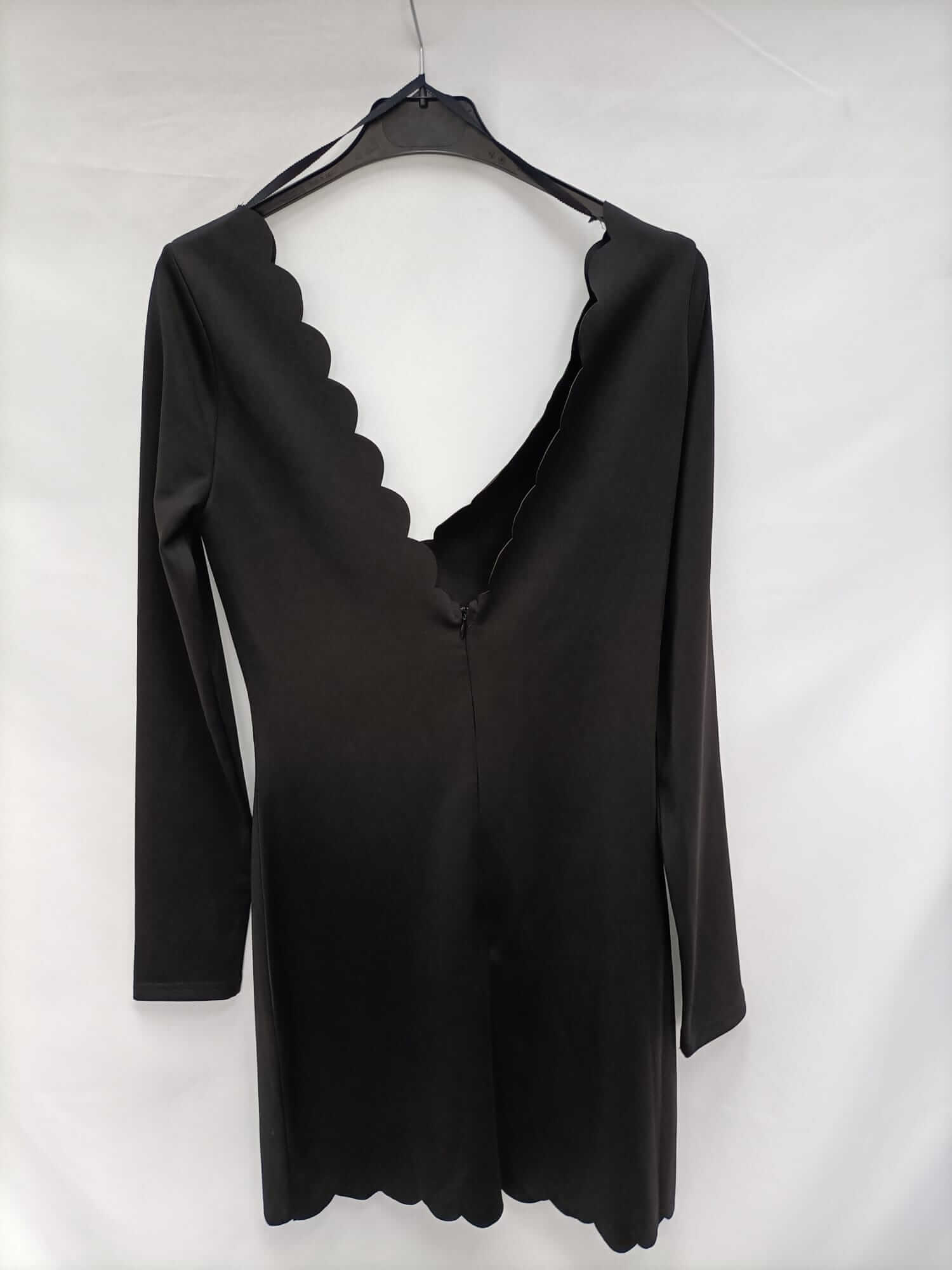 Vestido corto negro de tejido de neopreno elástico. Escote ondulado. Elastico. Largo 84 cm