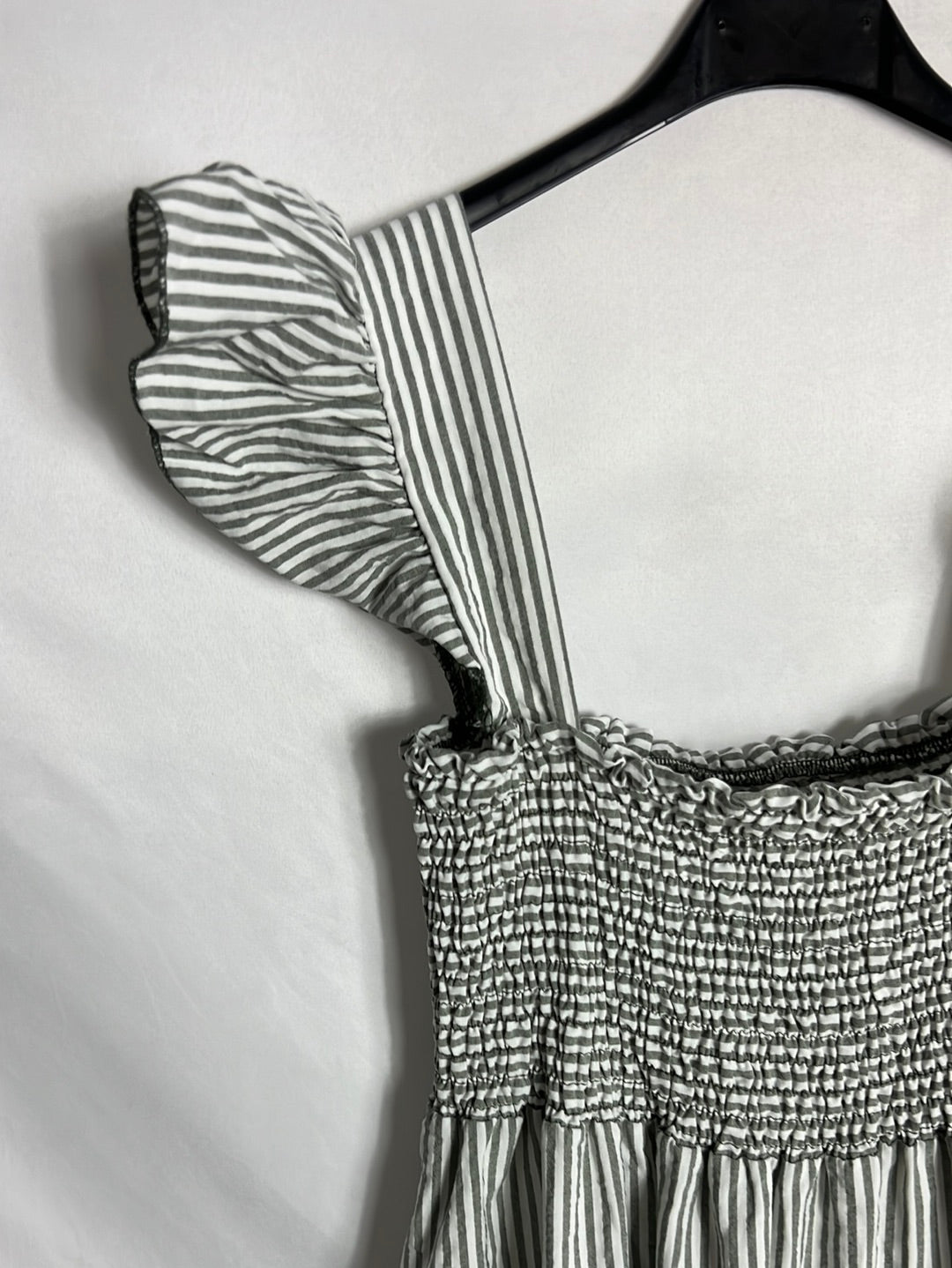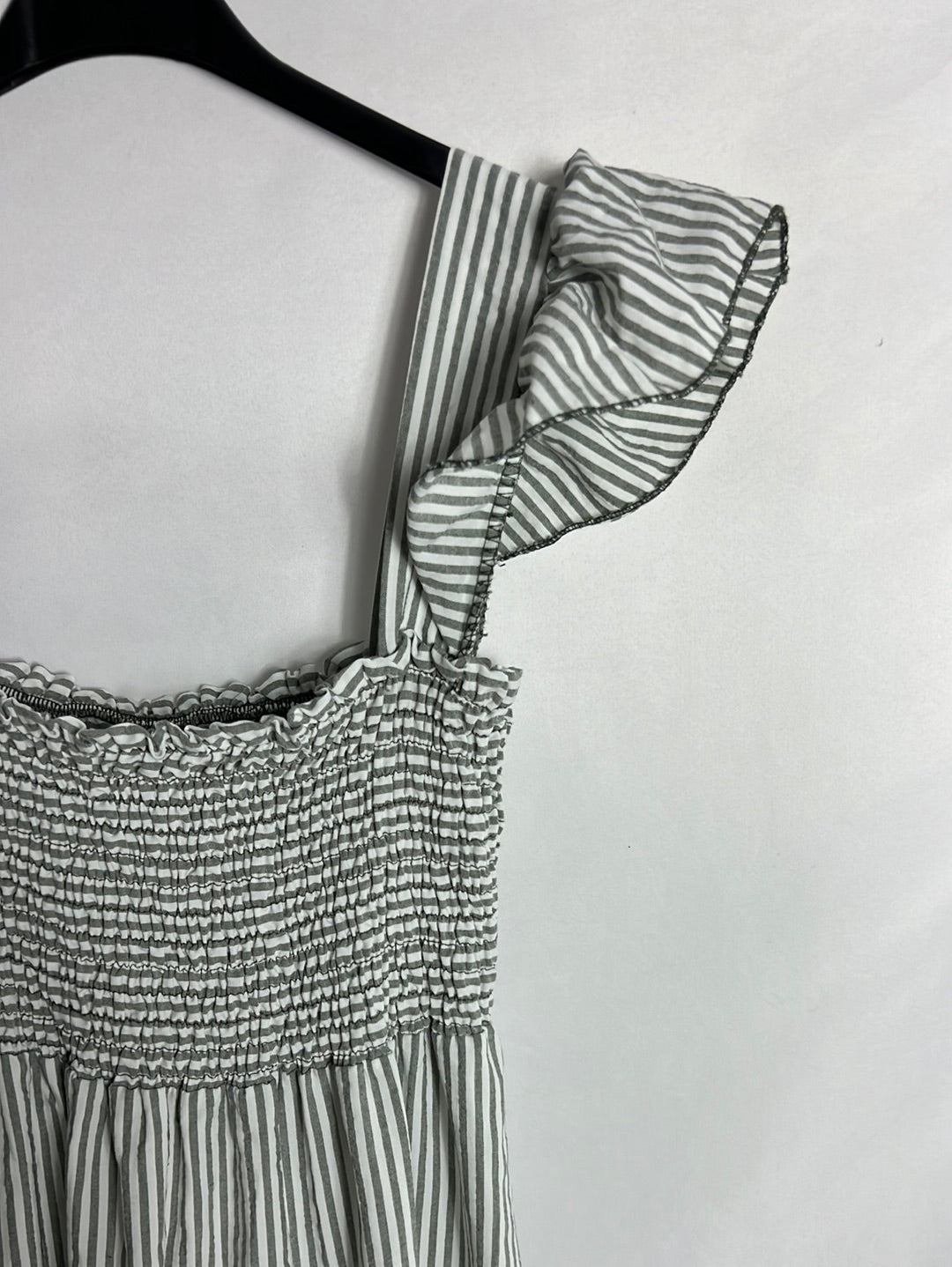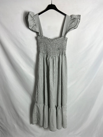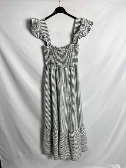 vestido largo de rayas gris y blanco con escote elástico de nido d abeja