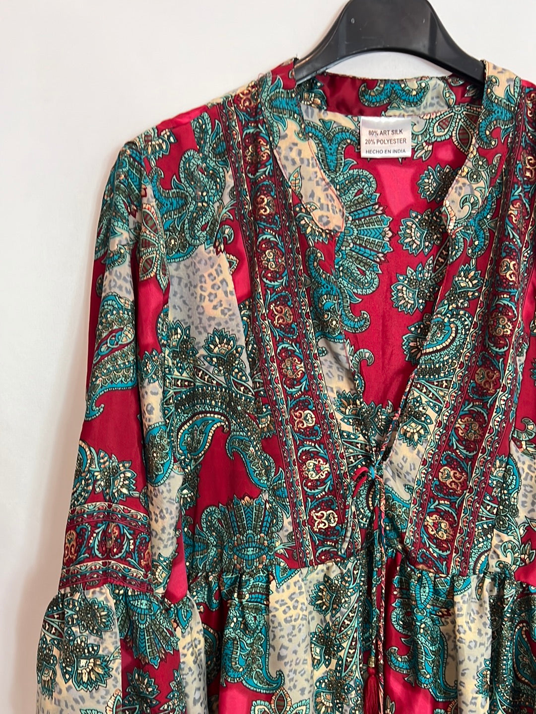 vestido corto fluido estampado turquesa y rojo. 80% seda