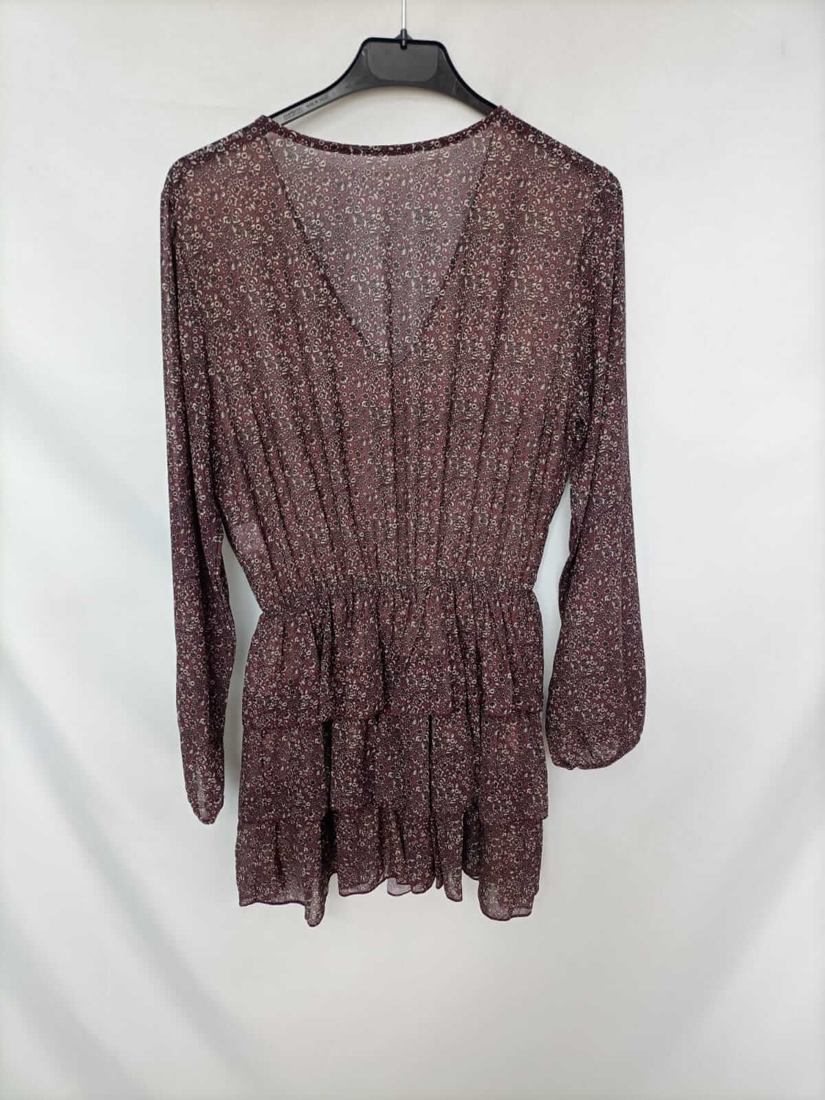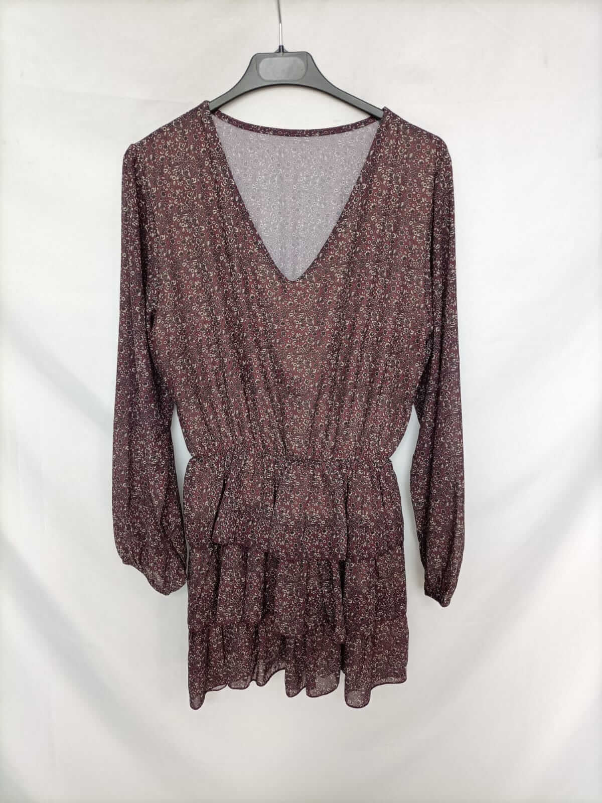 Otras. Tu (s). Vestido corto burdeos con florecitas y volantes en la falda. Fluido. Elástico en la cintura. De sisa a sisa 50 cm largo 79 cm