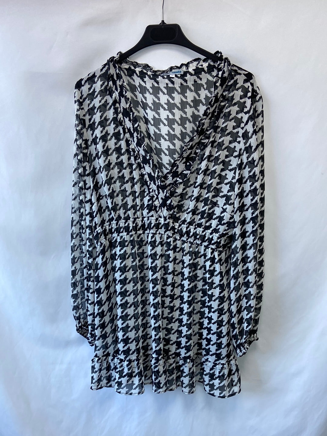blusa larga semitransparente estampado para de gallo. Corte elástico en la cintura. Largo 78 cm