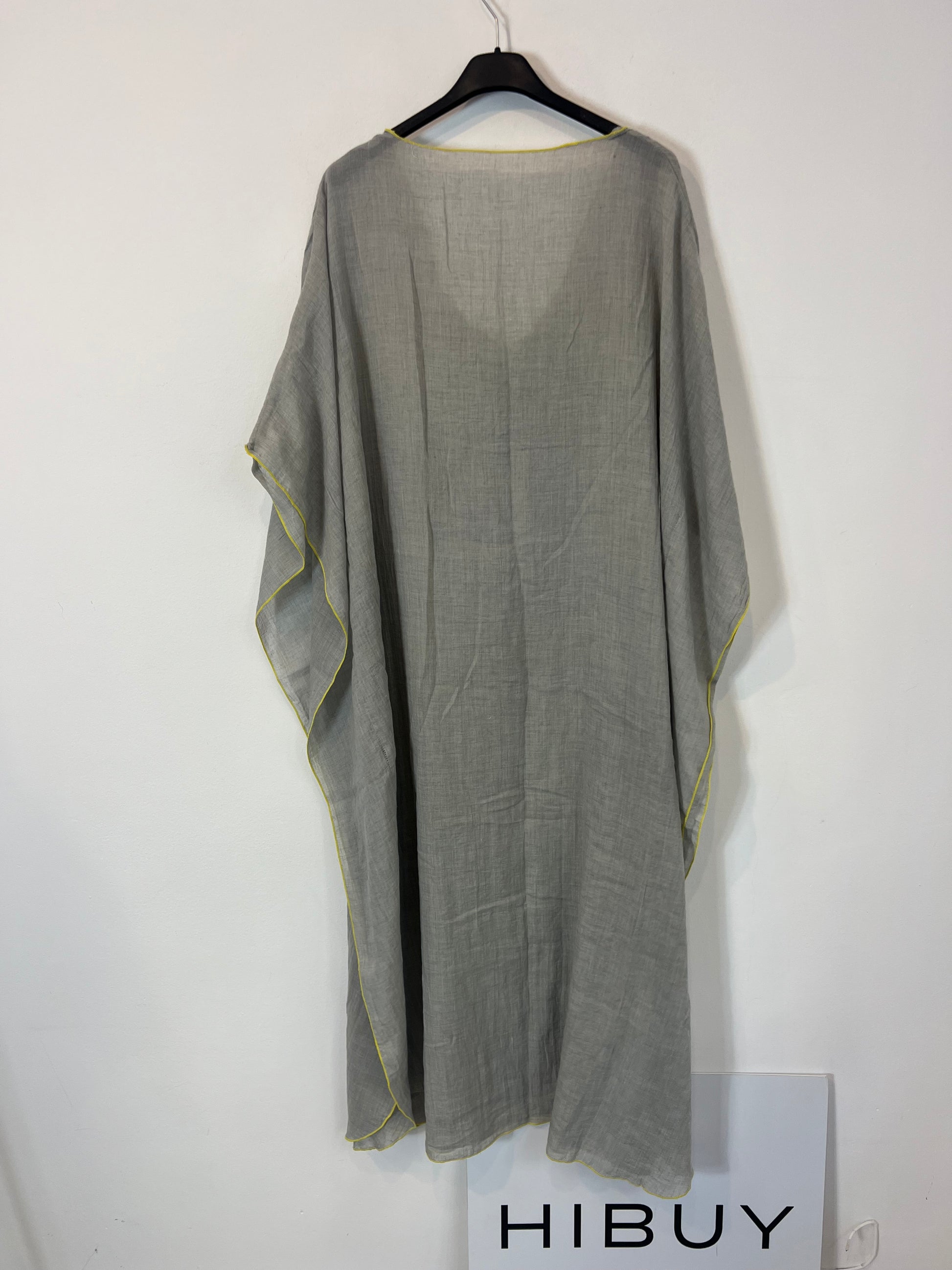 Vestido gris estilo kaftán. Estilo lino con detalles en amarillo . Tara: mini marca en cuello poco visible