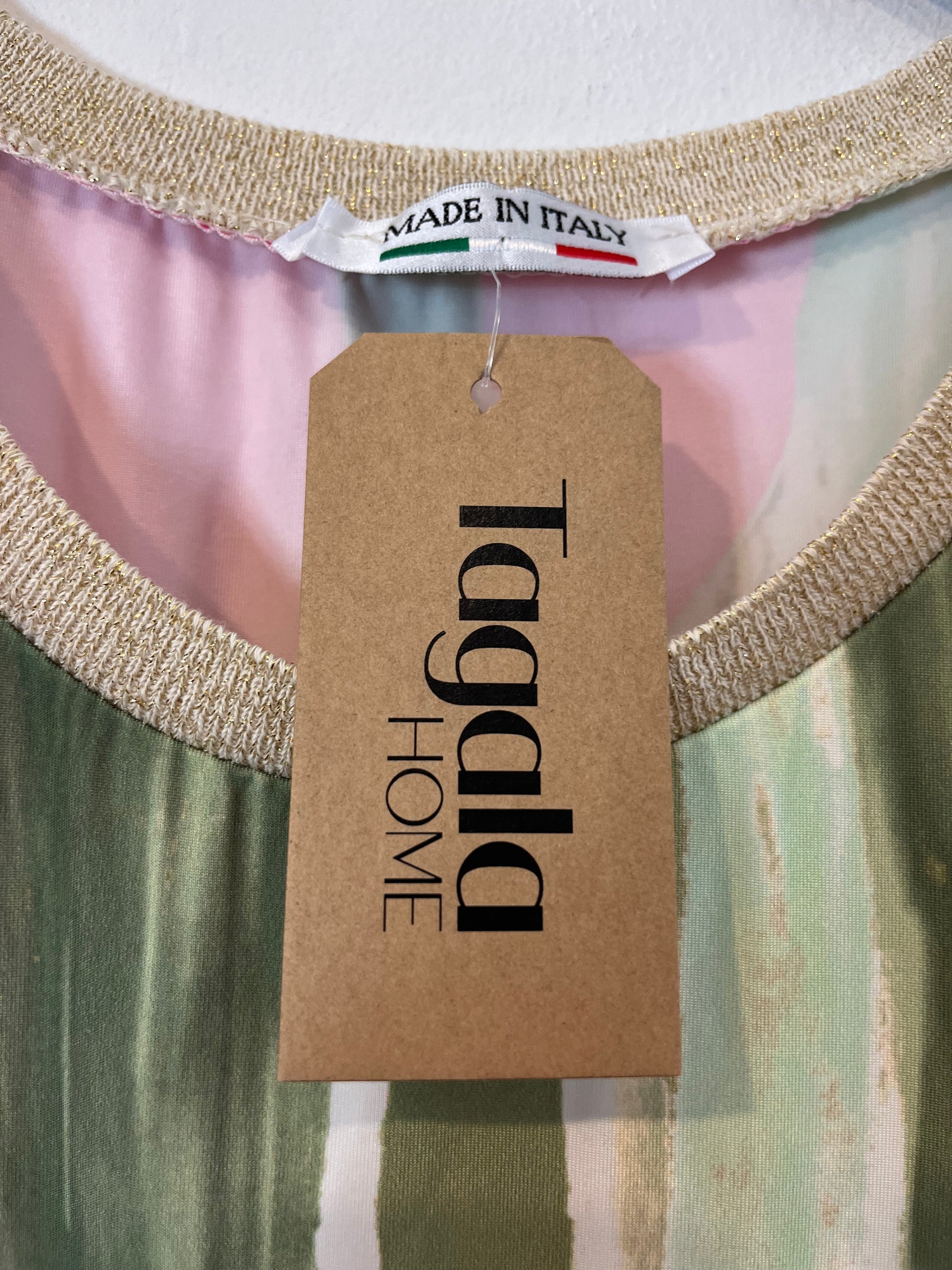 NUEVO CON ETIQUETA. Vestido largo fluido con estampado en rosa y verde y detalle de hilos dorados. De sisa a sisa 56 cm largo 137 cm