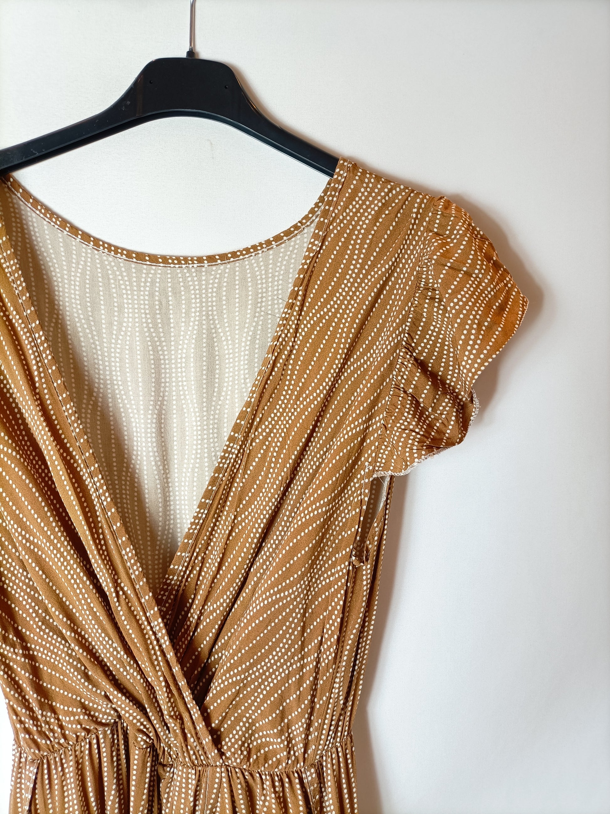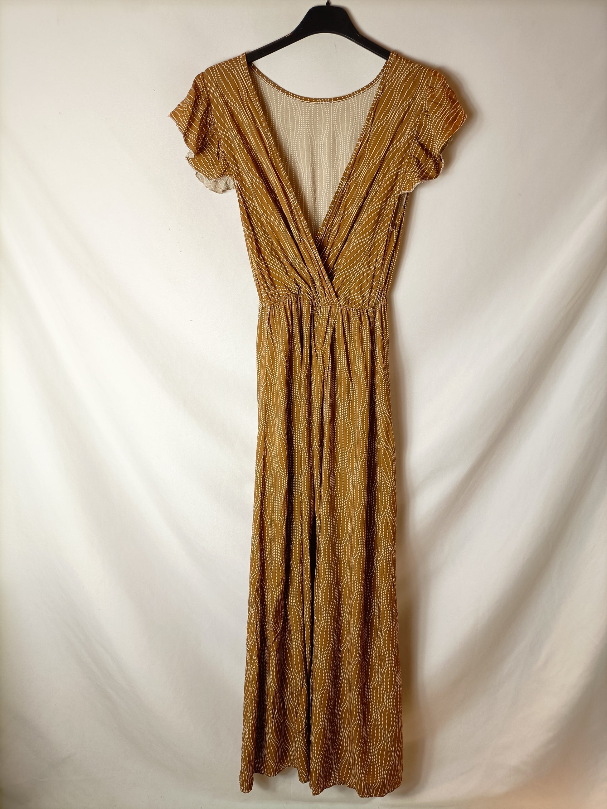 vestido largo marrón con lunarcitos. cintura elástica. falta cinturón