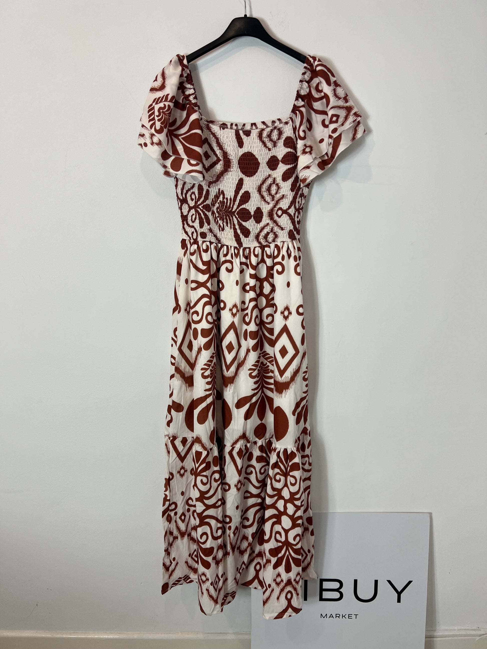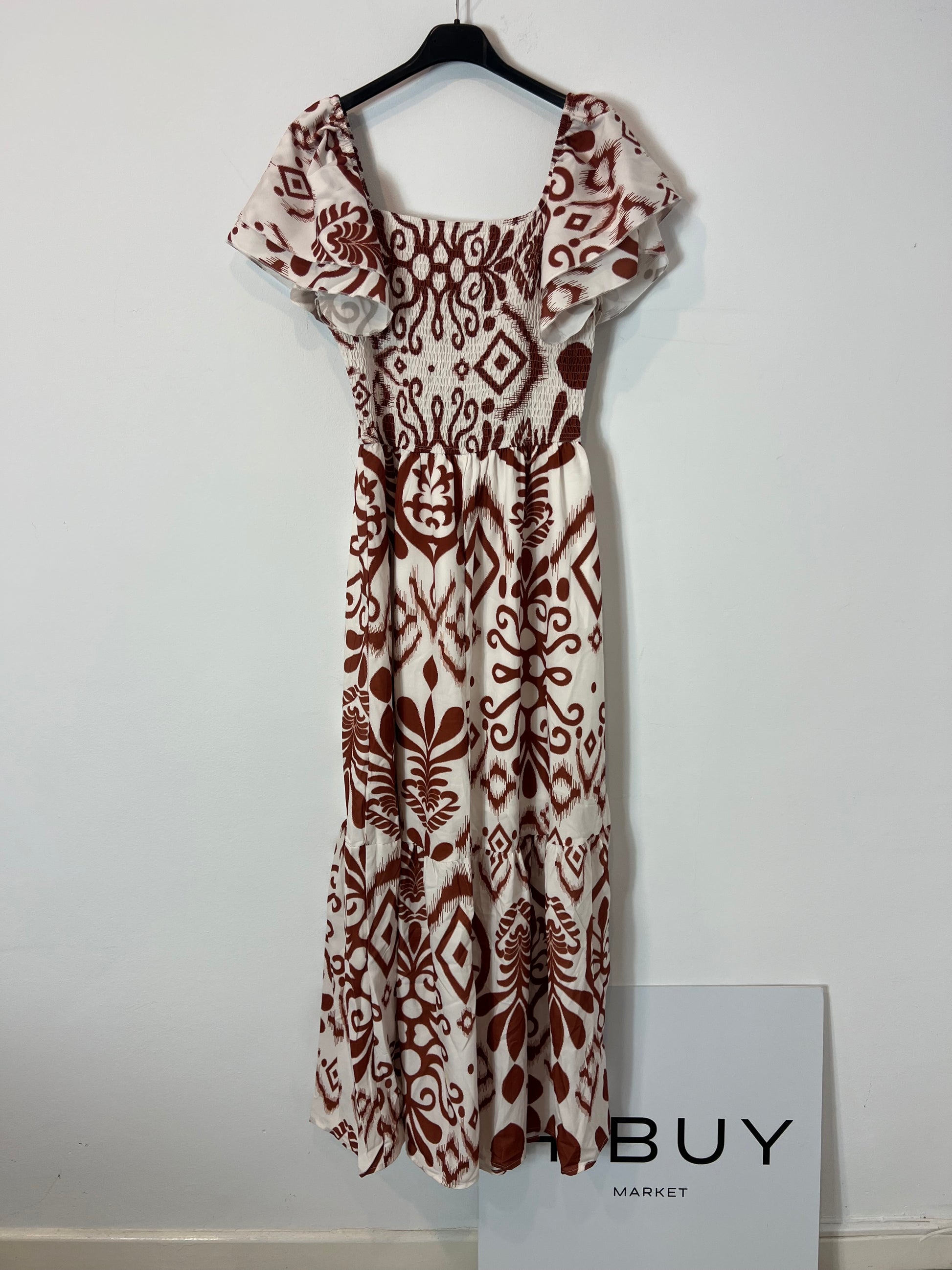 vestido largo fluido con estampado en marrón, Escote elástico nido de abeja