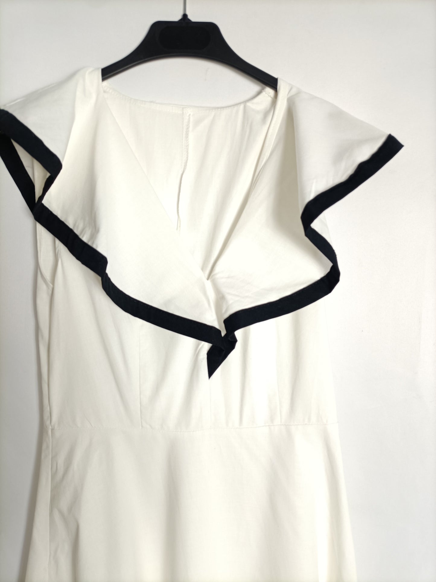 vestido midi blanco con cuello y detalle negro. de sisa a sisa 38 cm y largo 117 cm