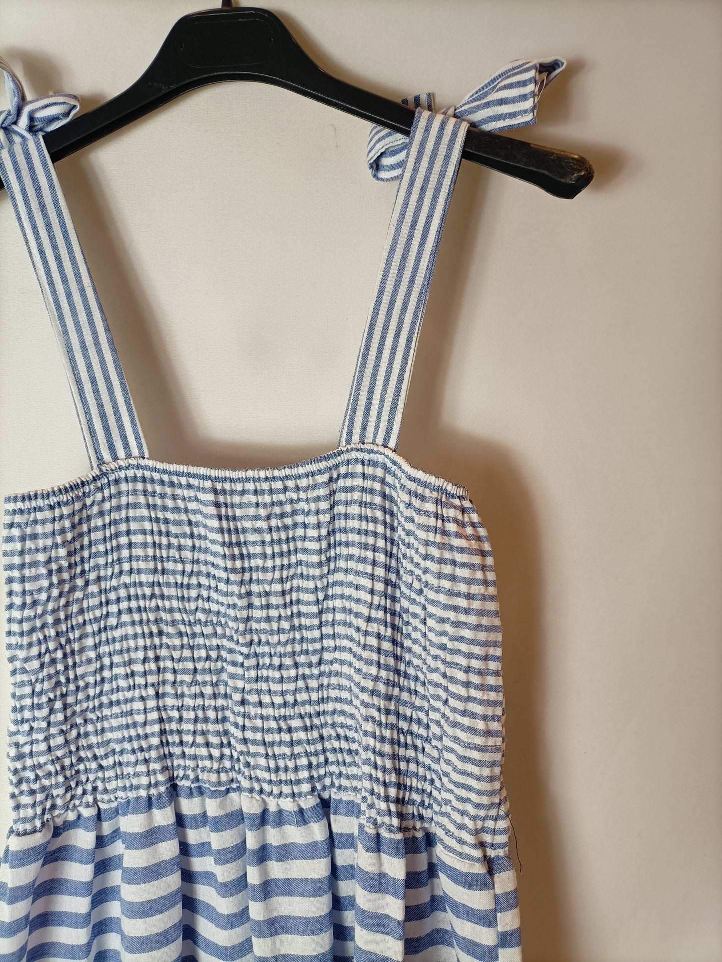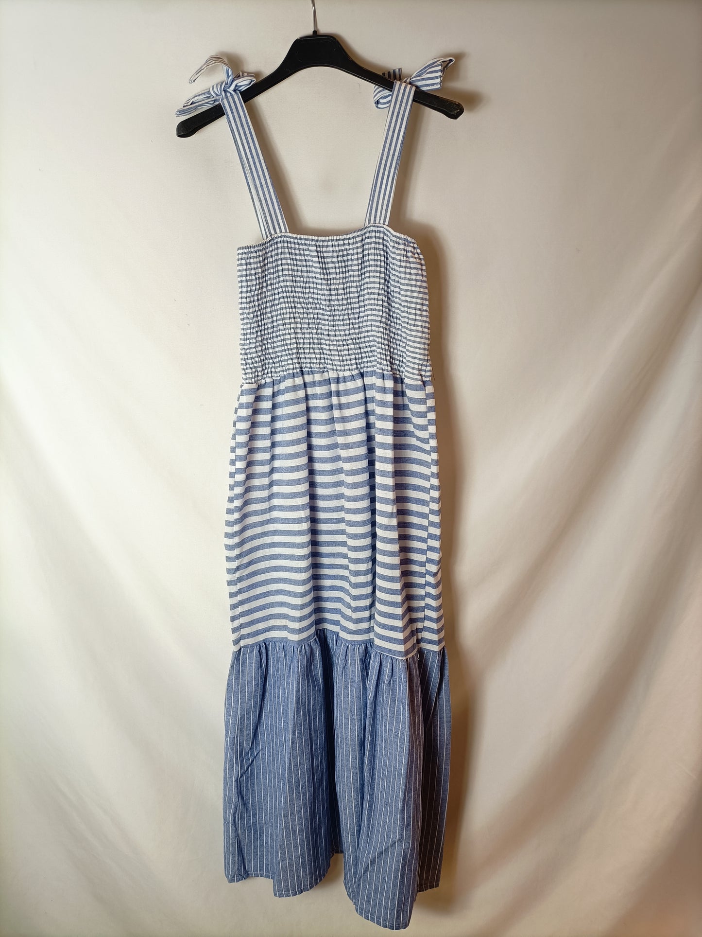 vestido midi de rayas blanco y azul con escote de nido de abeja