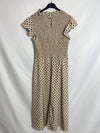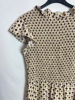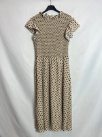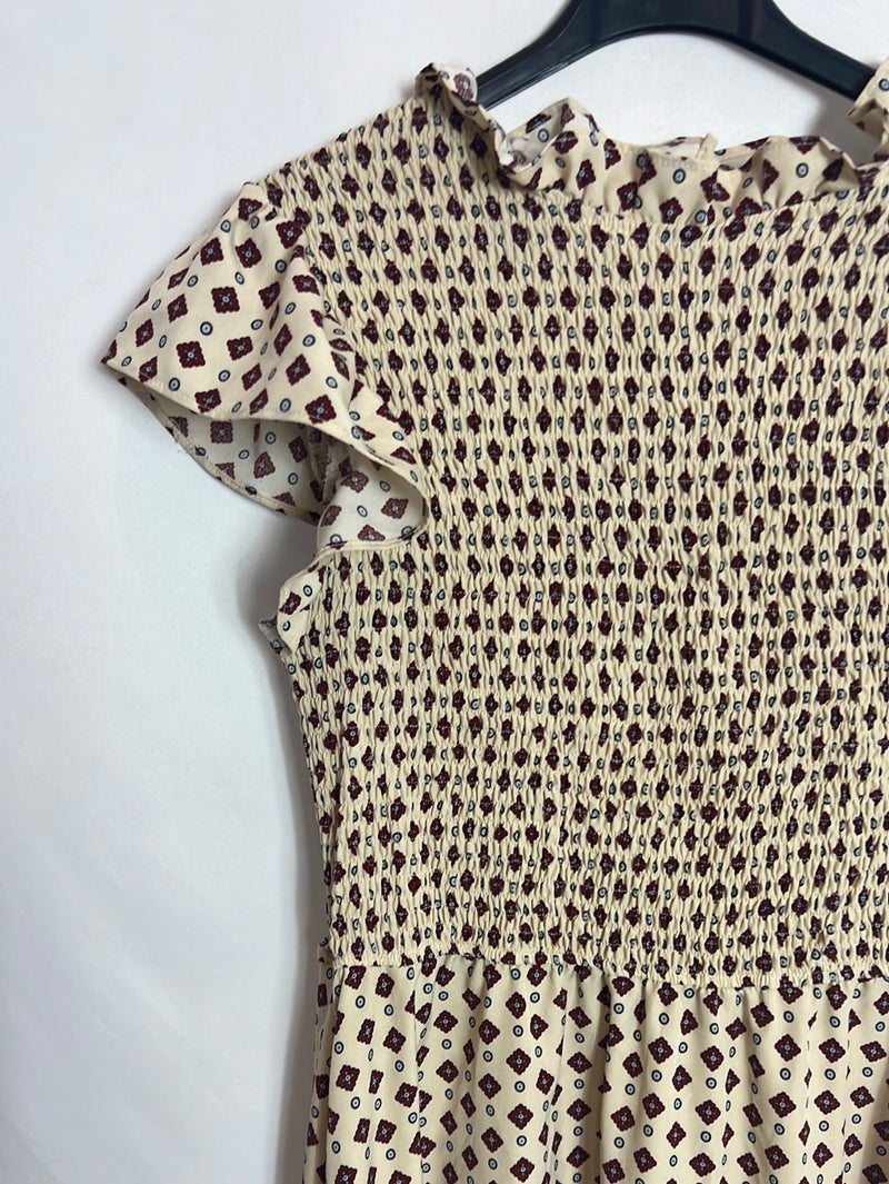 Vestido midi satinado estampado con detalles en cuello y hombros. Zona superior con tejido elástico nido de abeja